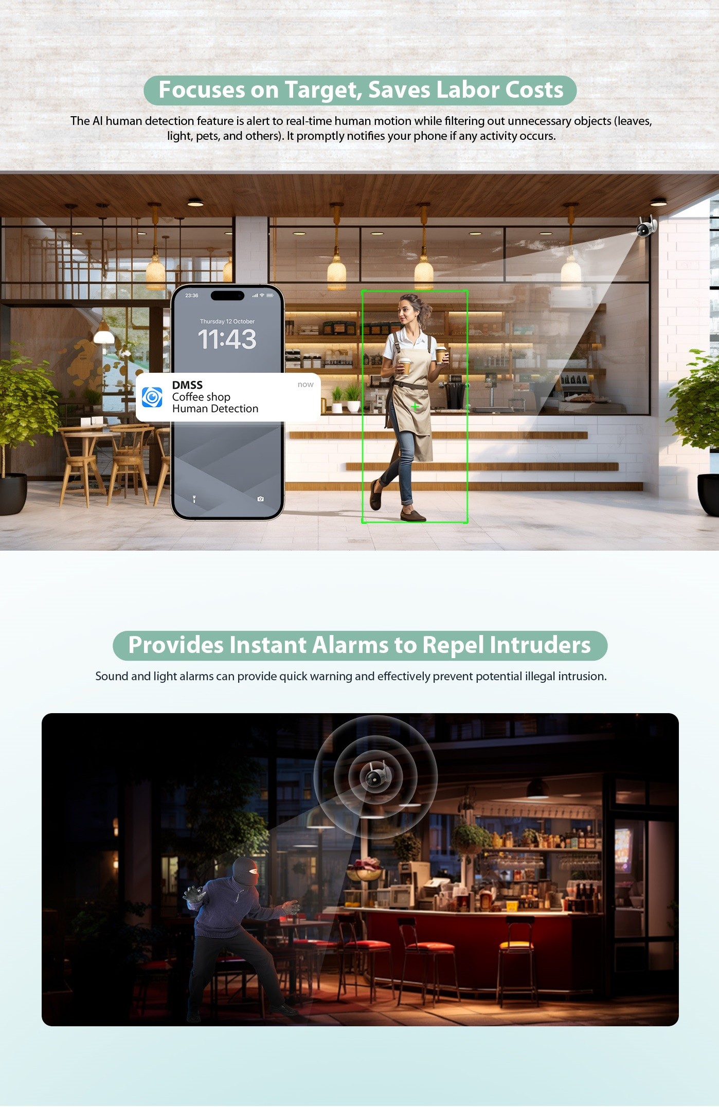 - They capture sharp, detailed images of scenes in high definition and offer powerful functions, such as AI human detection, to accurately trigger alarms. Information is also synchronously sent to your phone to keep you up-to-date