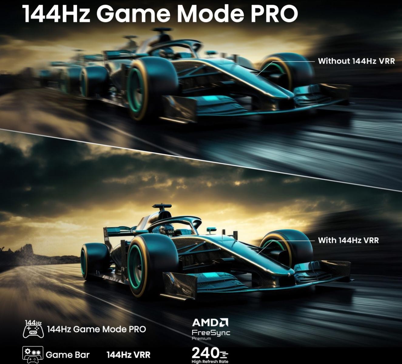 - 144Hz Game Mode PRO Unlock your ultimate gaming potential with 144Hz Game Mode PRO with an integrated game bar, say goodbye to the lag and enjoy the tear-free gameplay.