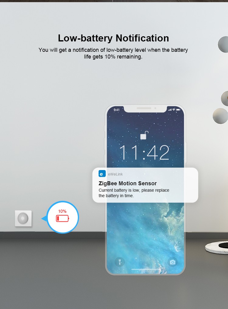 Detects movement to trigger alerts and automate ZigBee devices; requires ZigBee Bridge; 6 m range, 110° view; 3V CR2450 battery; quick peel-install.