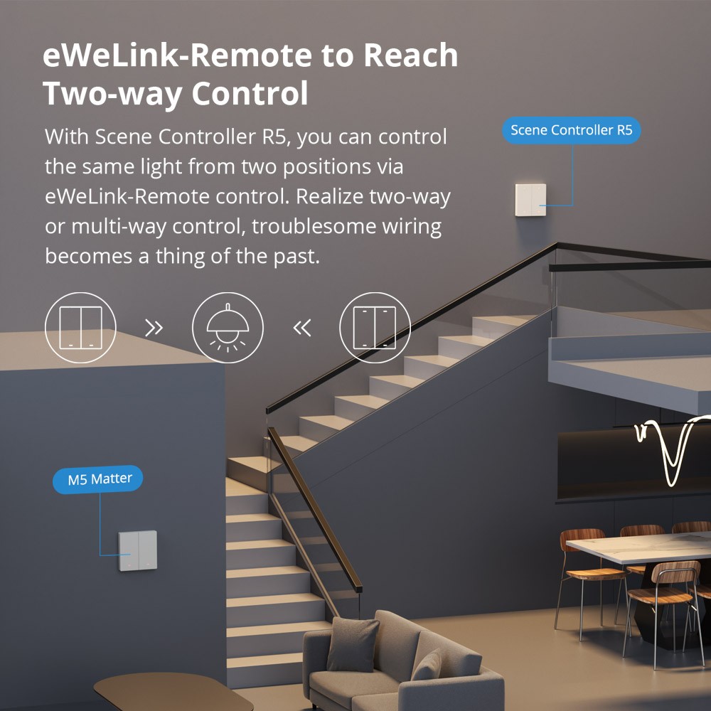 - ”eWeLink-Remote” Control : M5 Matter is a smart switch with the gateway function of “eWeLink-Remote“. With Scene Controller R5 or S-MATE2, you can control the same light from two positions via eWeLink-Remote control. Realize two-way or multi-way control, troublesome wiring becomes a thing of the past.