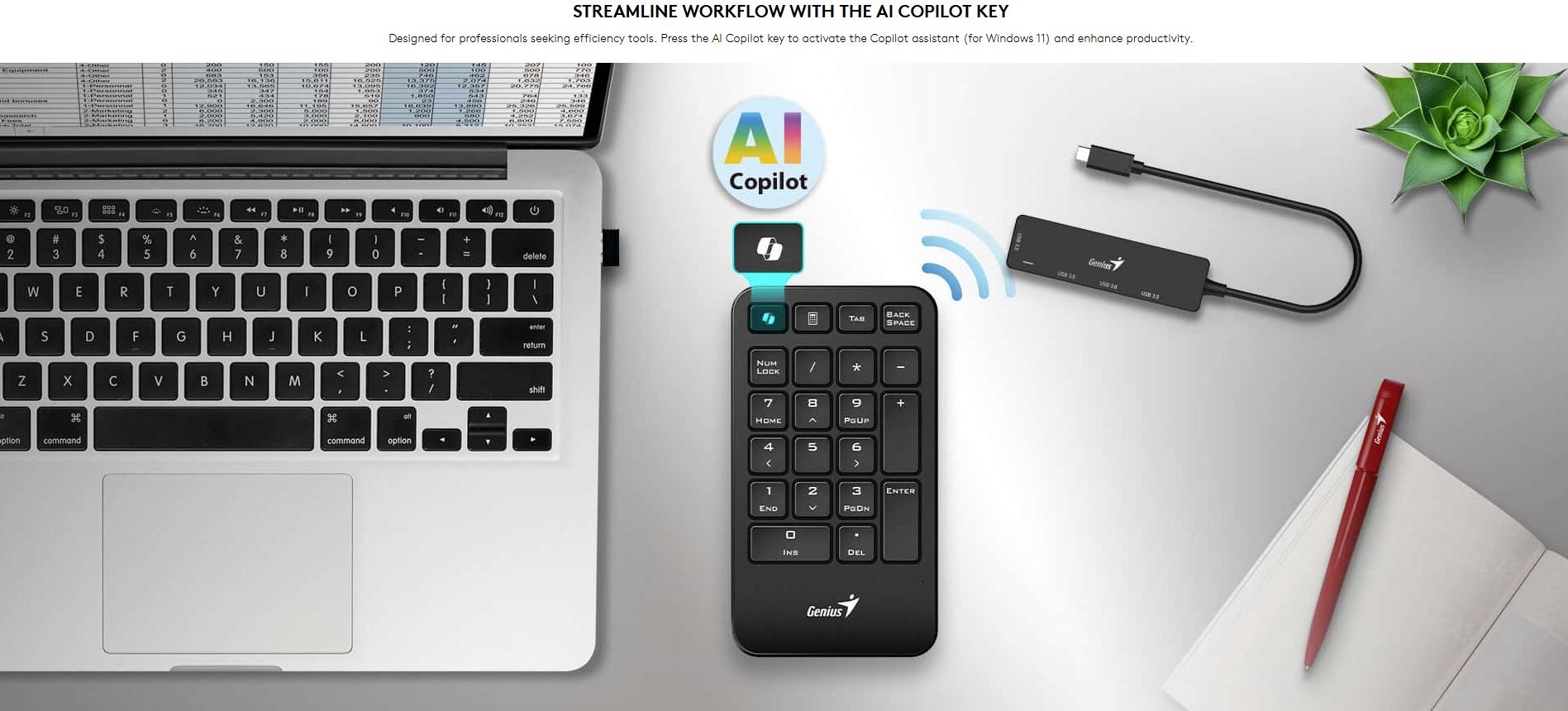 2.4GHz wireless numeric keypad with palm rest; AI Copilot key for Copilot on Windows 11+; silent typing; USB receiver slot; NumLock, Calculator, Tab, Backspace.