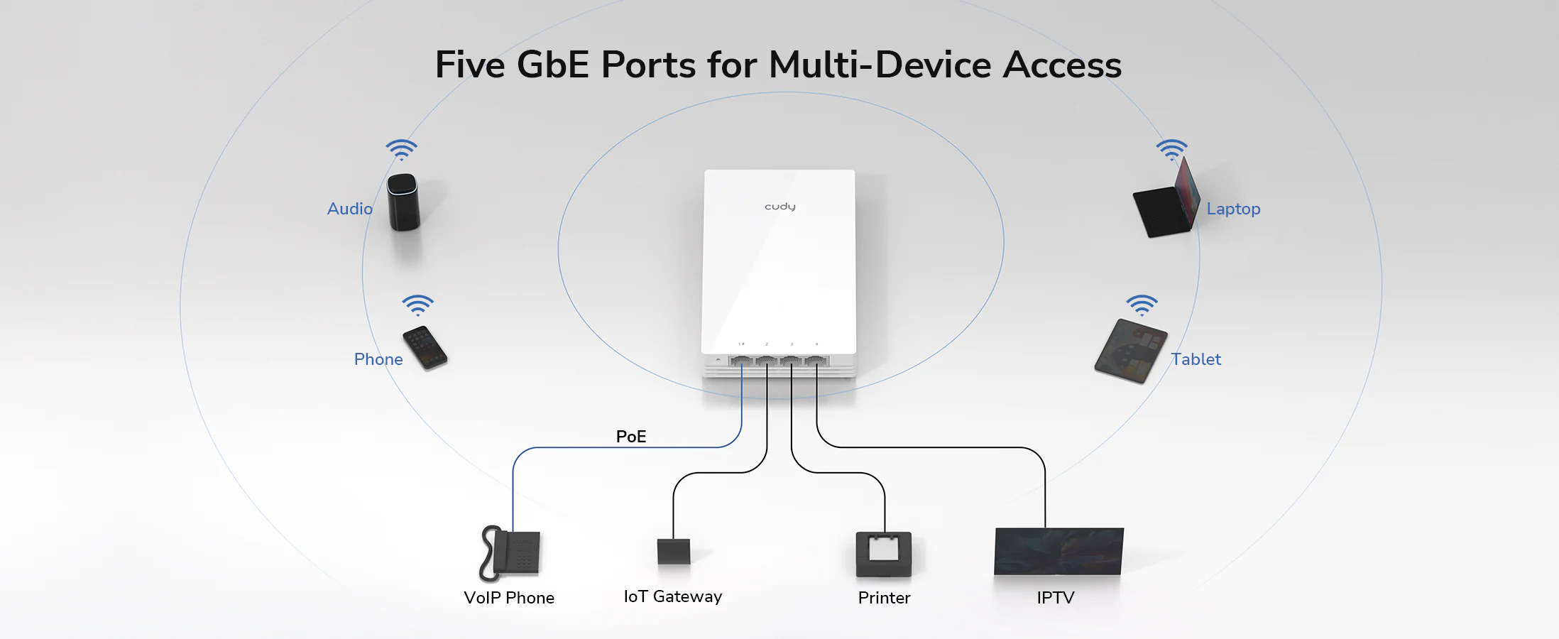 - 1× GbE PoE In, 1× GbE PoE Out, 3× GbE