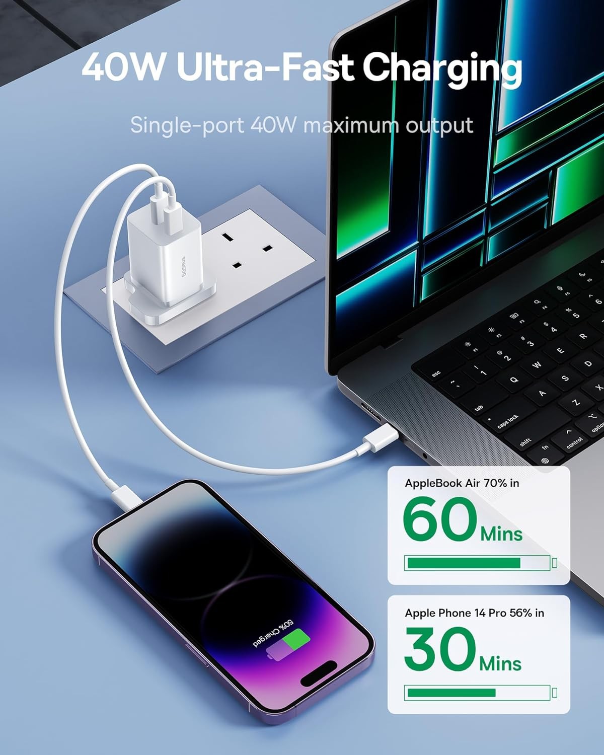 - 40W Max Charging Perfect for MacBook Air users, the Baseus 40W USB-C charger rapidly charges your laptop from 0-70% in just an hour. This feature makes it an ideal iPhone 15, iPhone 14, and iPhone 15 Pro Max charger, ensuring your device is powered up quickly and efficiently.