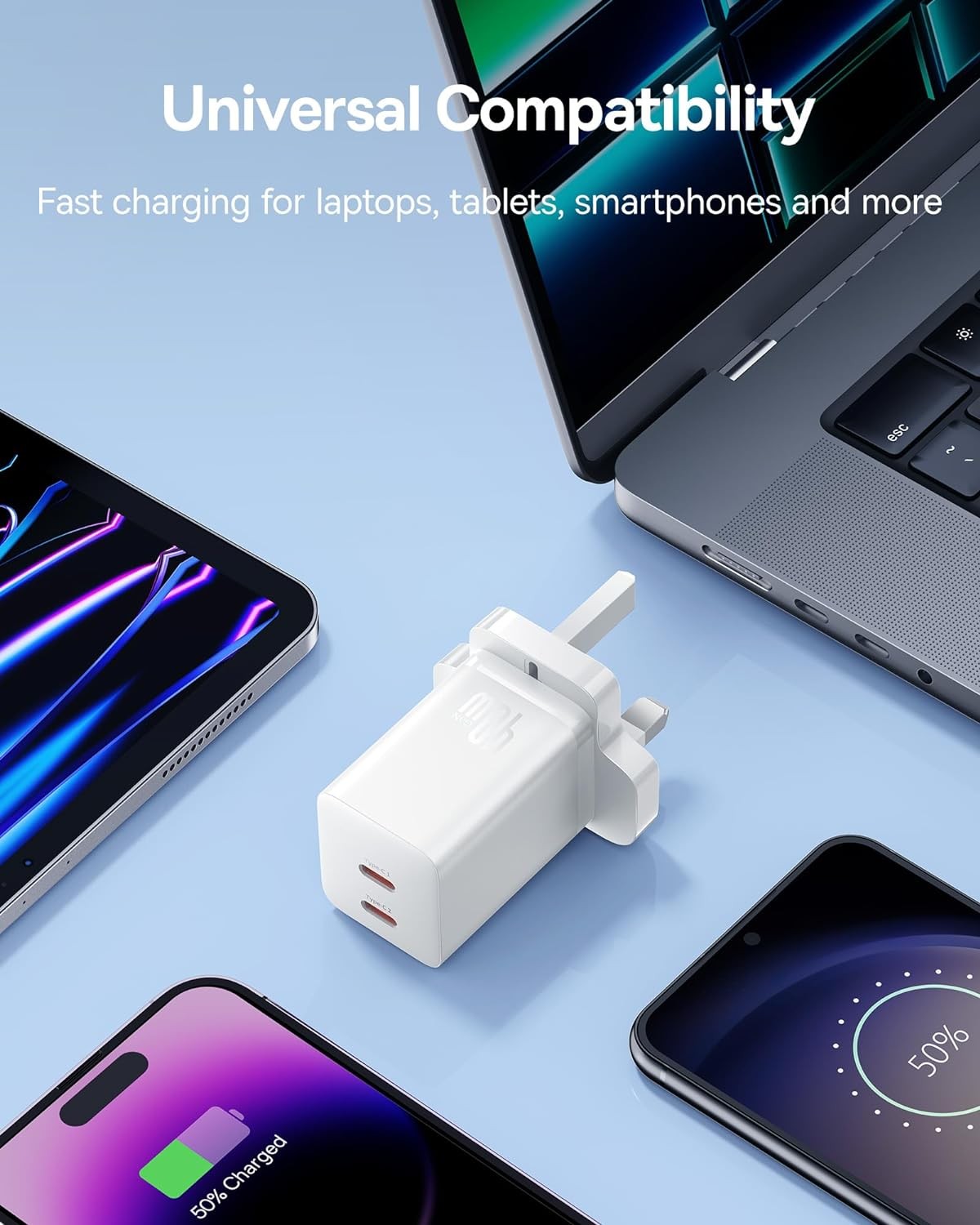40W dual USB-C GaN wall charger with UK plug; compact Mini design, suitable for MacBook Air and iPhone devices.