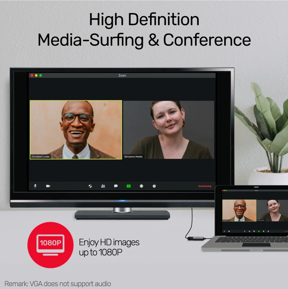 USB-C to VGA adapter with 1080p60 output; backward compatible USB-C supports Thunderbolt 3 or USB-C with DisplayPort Alt Mode.
