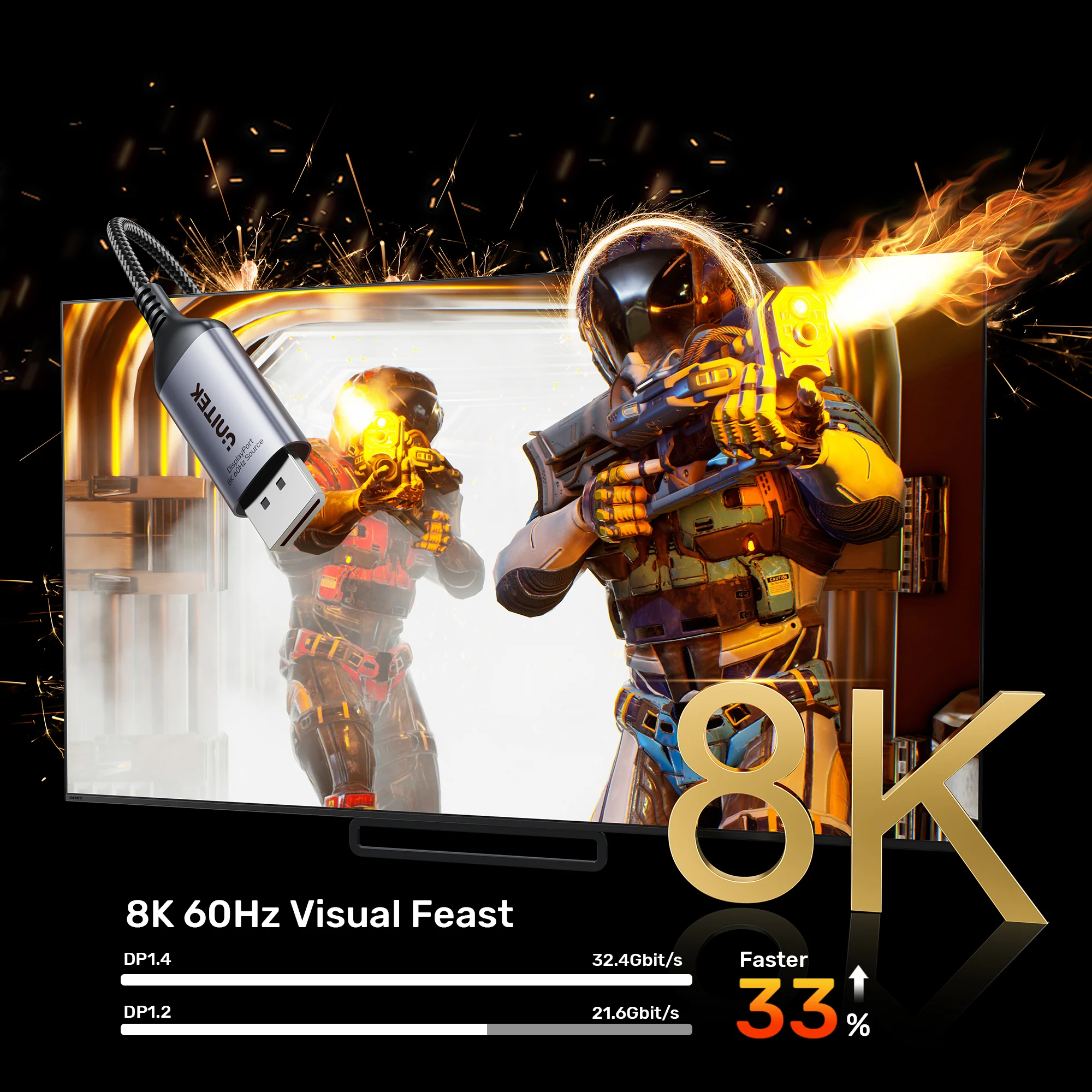 - 8K 60Hz Visual Feast:UNITEK uni-directional DP to HDMI adapter can delivers Ultra HD 8K (7680x4320) video at a high 60Hz refresh rate. It is backward compatible with 4K@120Hz, 2K@240Hz, and 1080P@240Hz. It also supports 32.4 Gbps bandwidth (HBR3), HDR, VRR, Dolby 7.1, HDCP 2.3, DSC 1.2a, 32 audio channels and FreeSync.