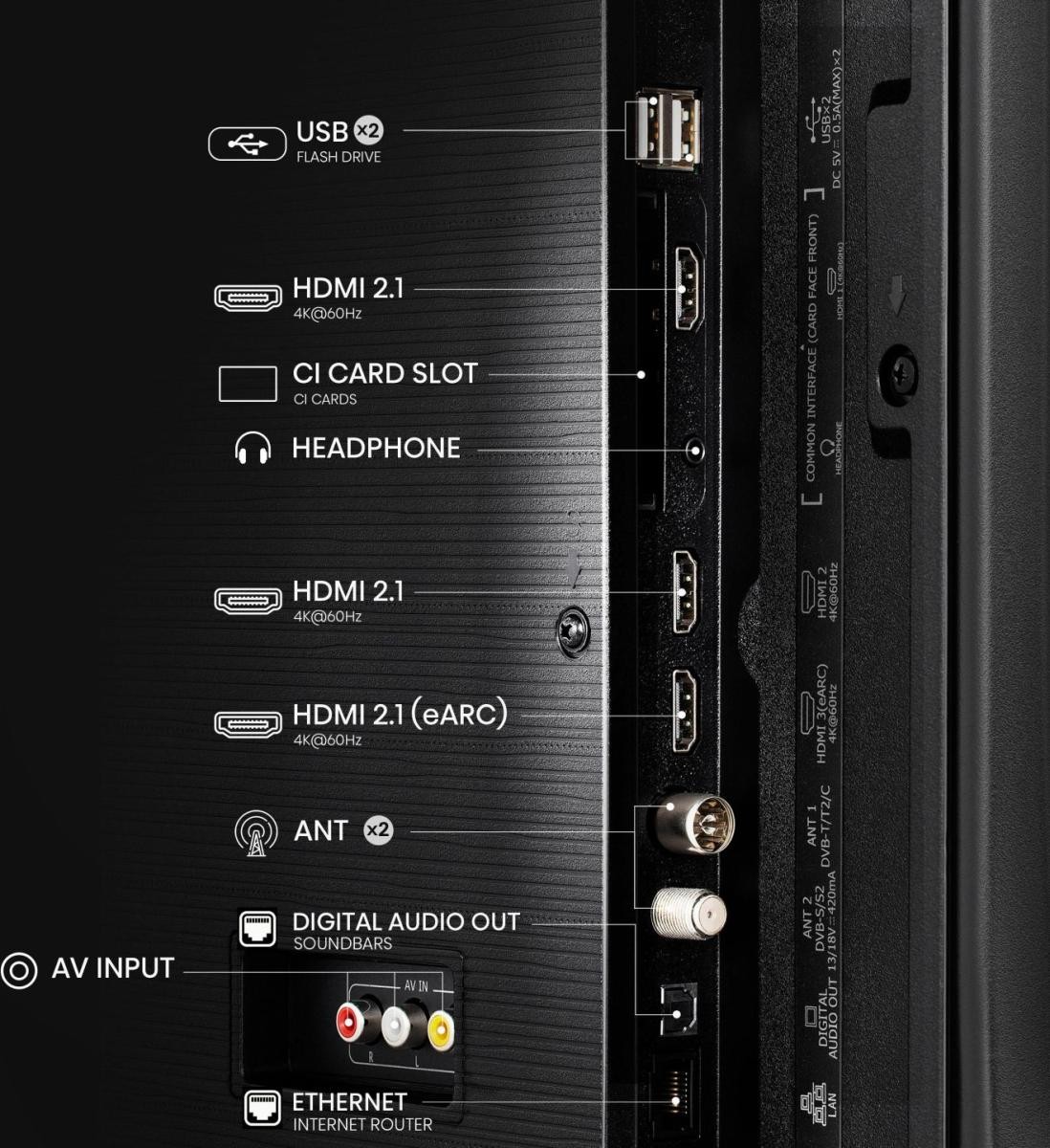 - Other Ports: Ethernet (RJ45), Optical Digital Audio Out (SPDIF), RF Tuner (2x), Composite AV Input (1x), Headphone Jack (3.5mm)