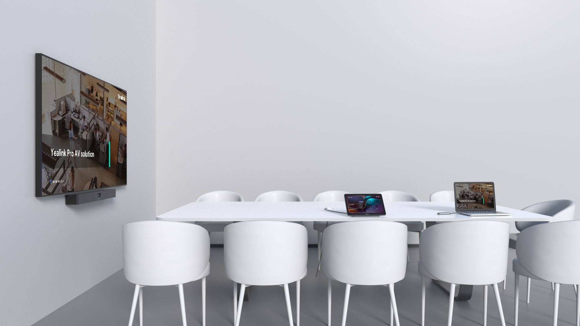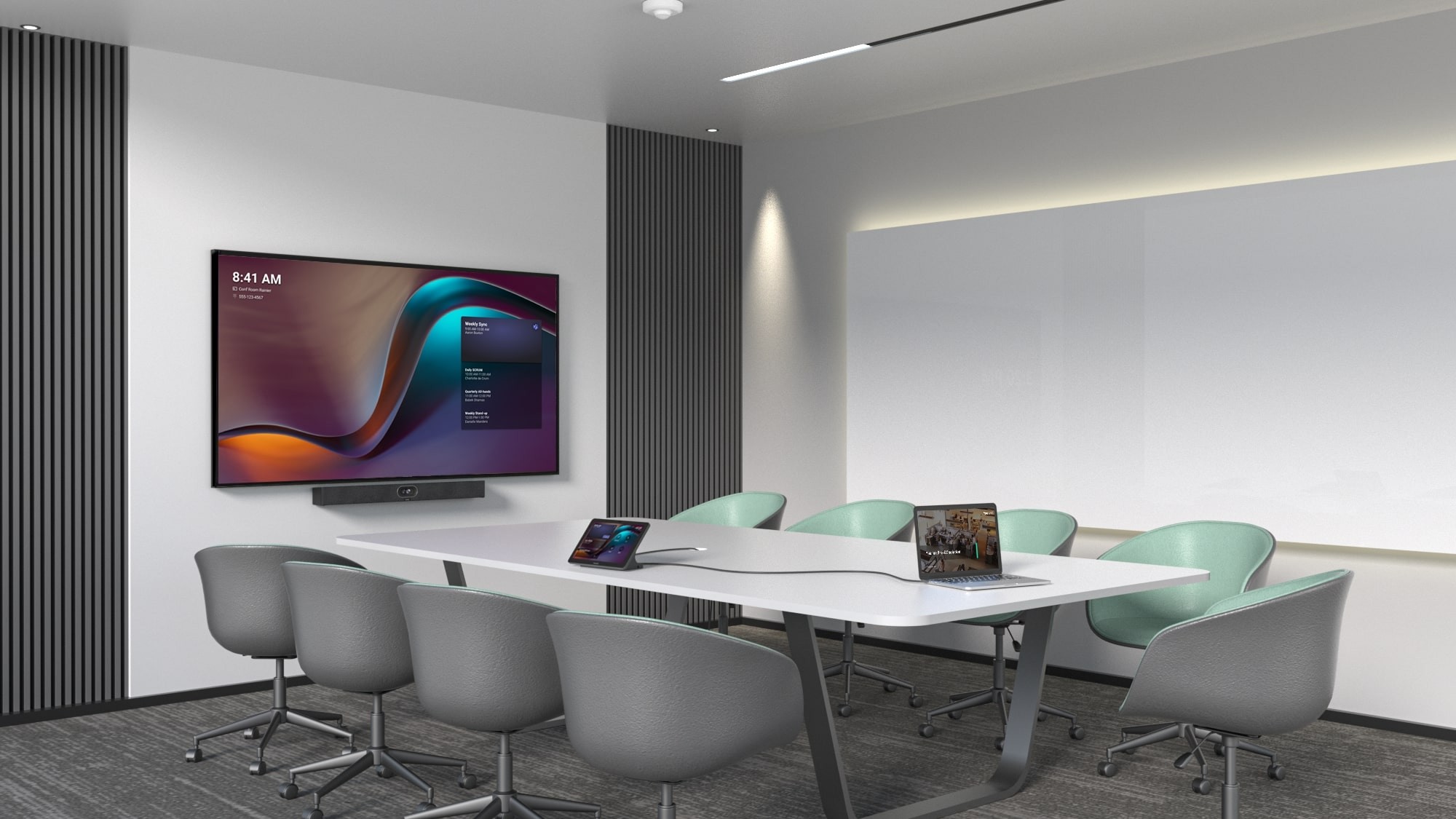A single ethernet cable from the bar to the touch console provides power and network connectivity to the touch console, eliminating extra cables. Signing in on the touch console synchronizes the entire system, removing the need to sign in on the touch console. Additionally, a single USB-C cable from the touch console to the PC enables 4K sharing, BYOD, and PDcharging.