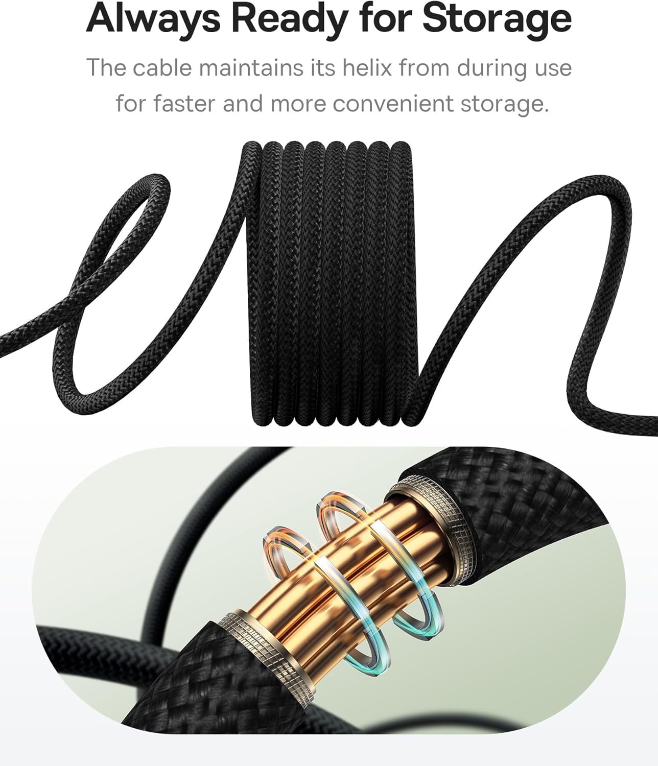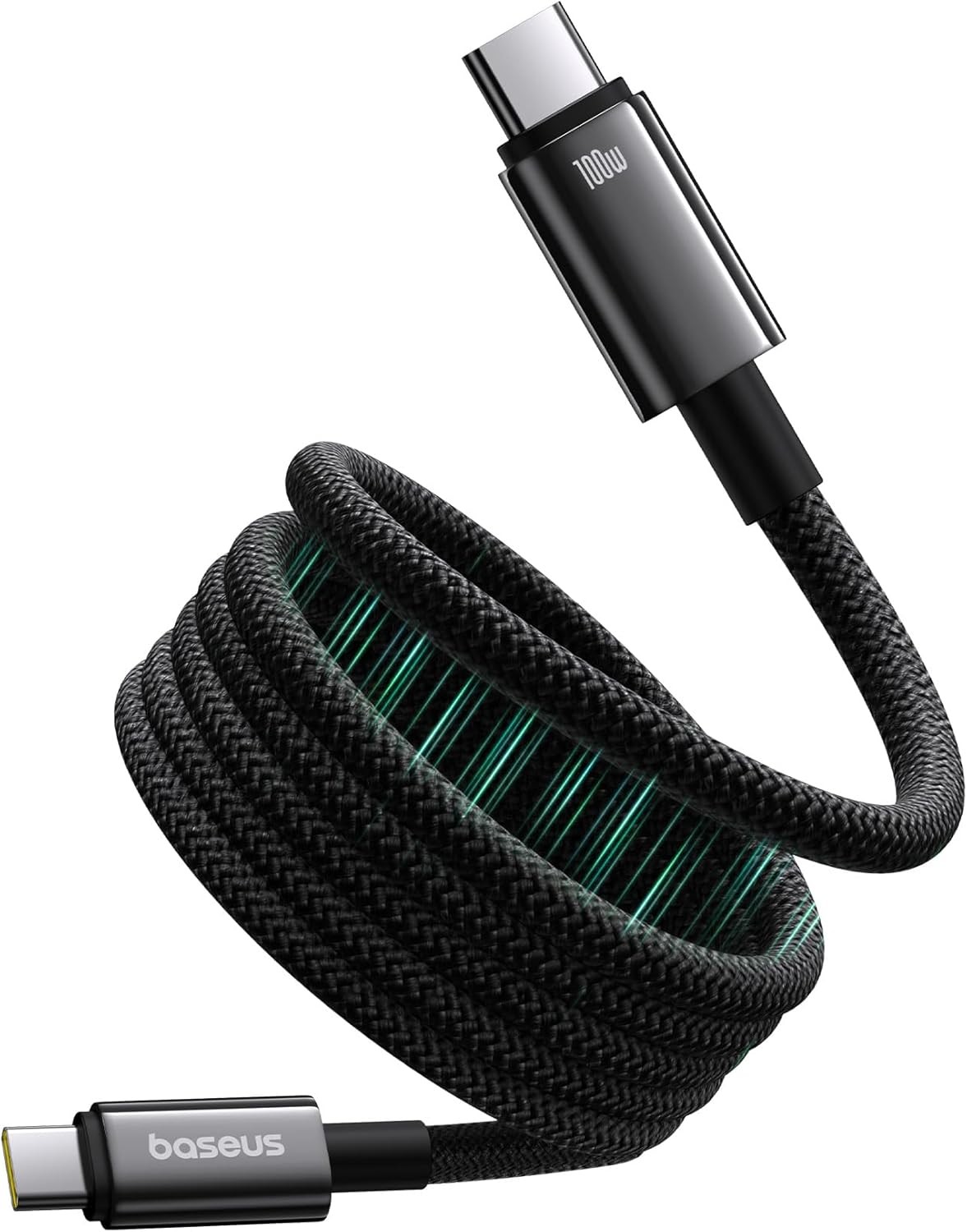 Magnetic anti-tangle design with auto-retract; 100W fast charging; braided USB-C to USB-C cable with E-Marker chip for smart charging.