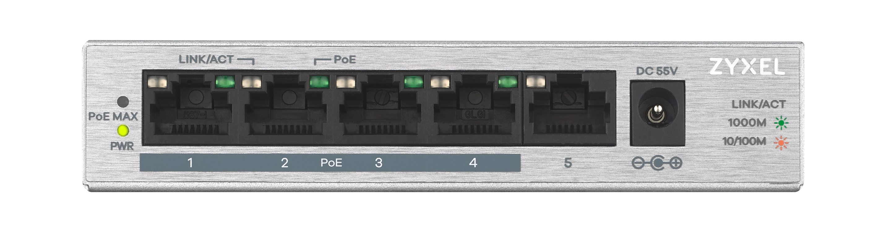 The Zyxel GS1005HP GbE Unmanaged PoE Switch is equipped with 5 Gigabit Ethernet ports, 4 of which are PoE ports that can deliver up to 60 w of total PoE budget. The GS1005HP can easily connect