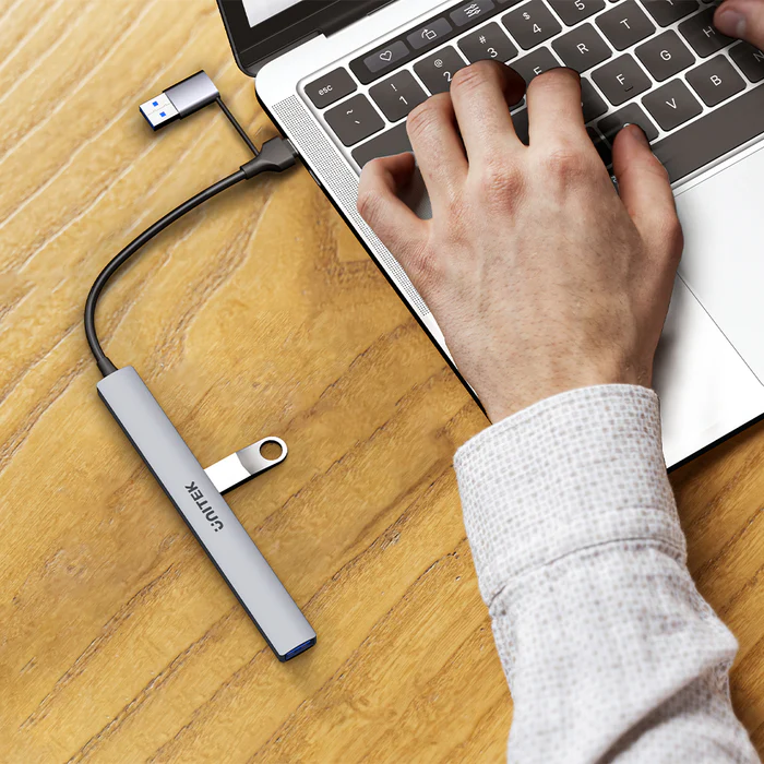 Unlock your devices with the UNITEK uHUB S7, a 7-in-1 hub with speeds up to 5Gbps. This compact hub converts one USB-C port into seven USB-A ports, and the included USB-A adapter ensures compatibility with both USB-A and USB-C hosts. Ideal for professionals and students, the UNITEK uHUB S7 boosts productivity on the go.