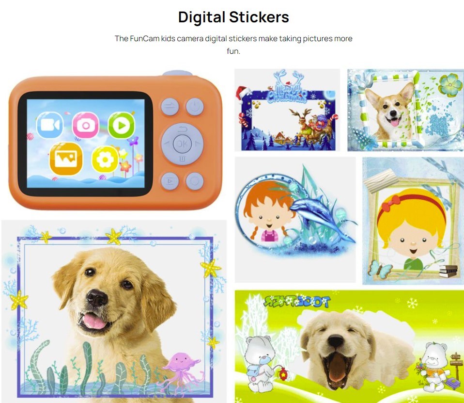 - Digital Stickers The FunCam kids camera digital stickers make taking pictures more fun.