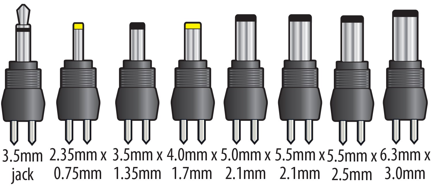 - Adaptor plugs: 3.5mm jack, 2.35 x 0.75mm, 3.5 x 1.35mm, 4 x 1.7mm, 5 x 2.1mm, 5.5 x 2.1mm, 5.5 x 2.5mm, 6.3 x 3mm