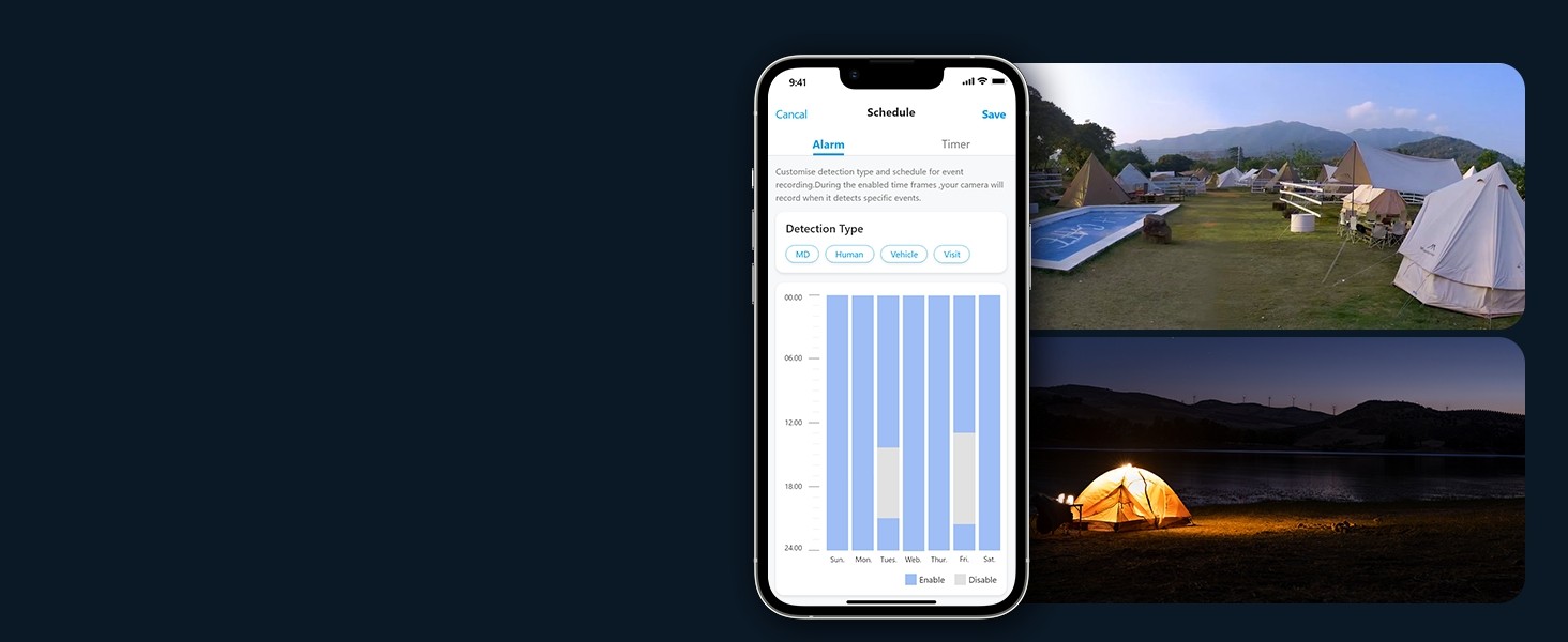 - Smart Alarm : PIR detection/human detection/vehicle detection