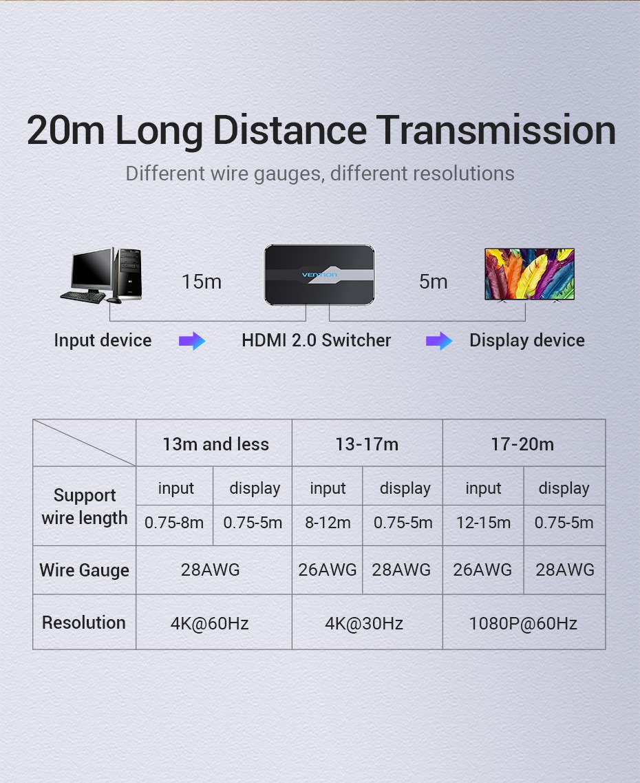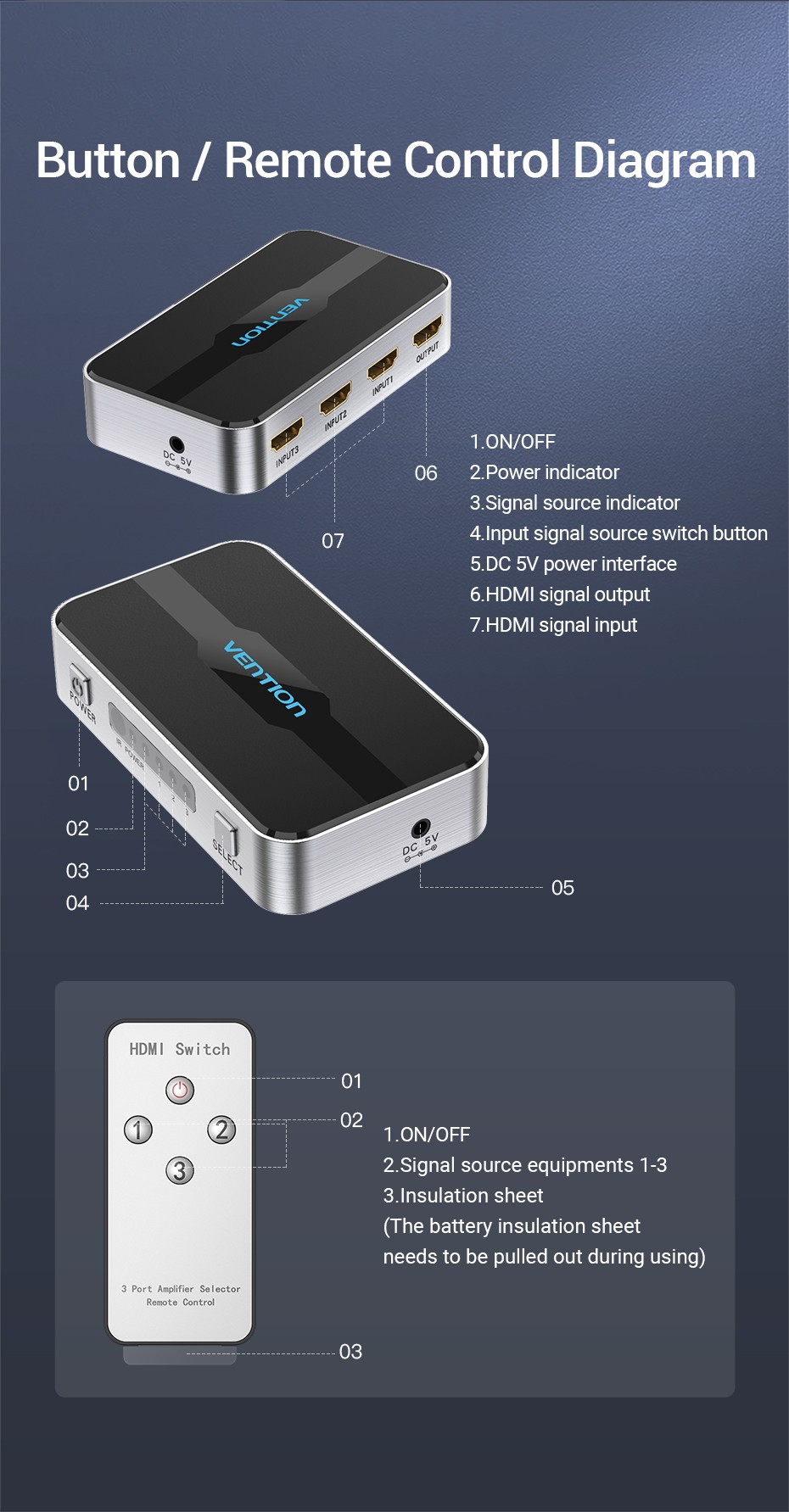Vention HDMI Switch - AFOH0 - 3-Port 4K 2.0 w Remote Control