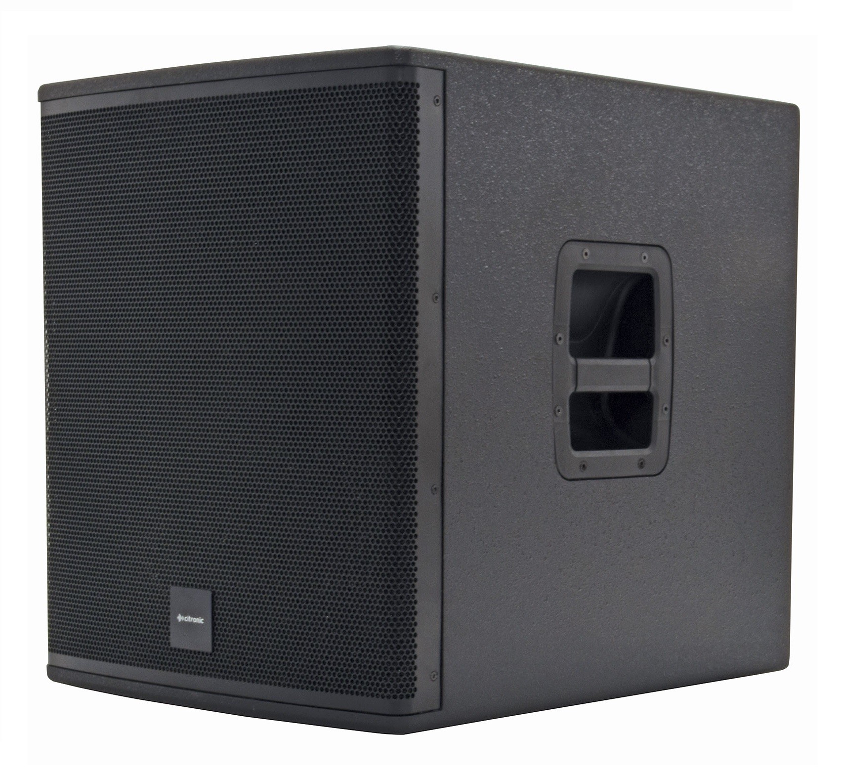 Lightweight 15mm MDF passive subwoofer with compact footprint, integral side handles, 35mm socket compatibility, and 500Wrms.