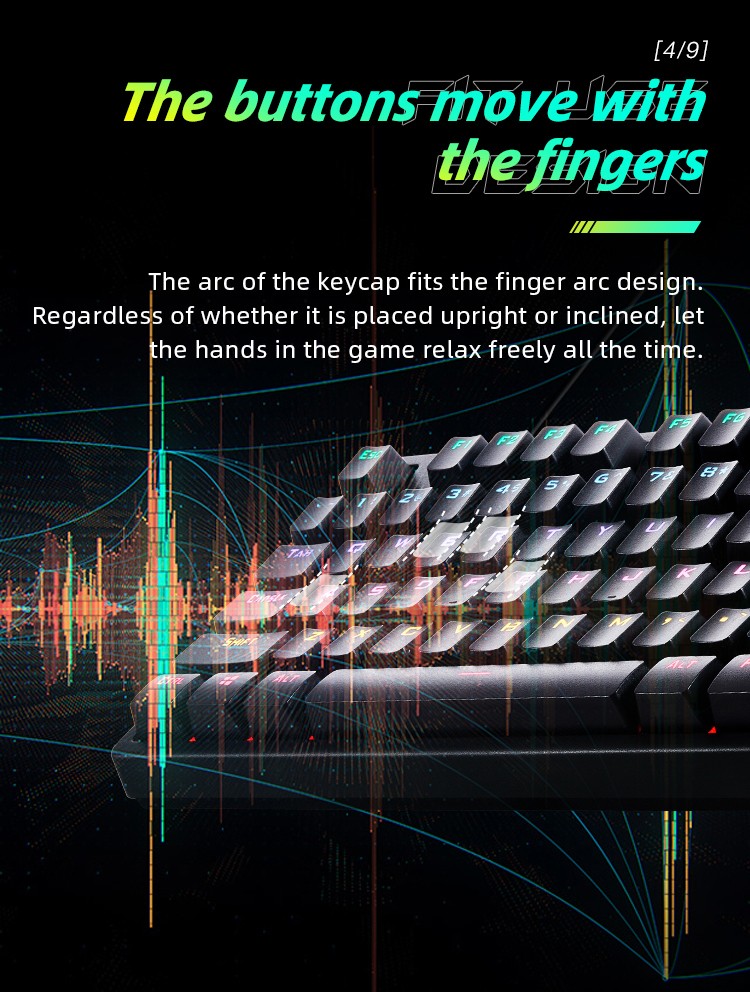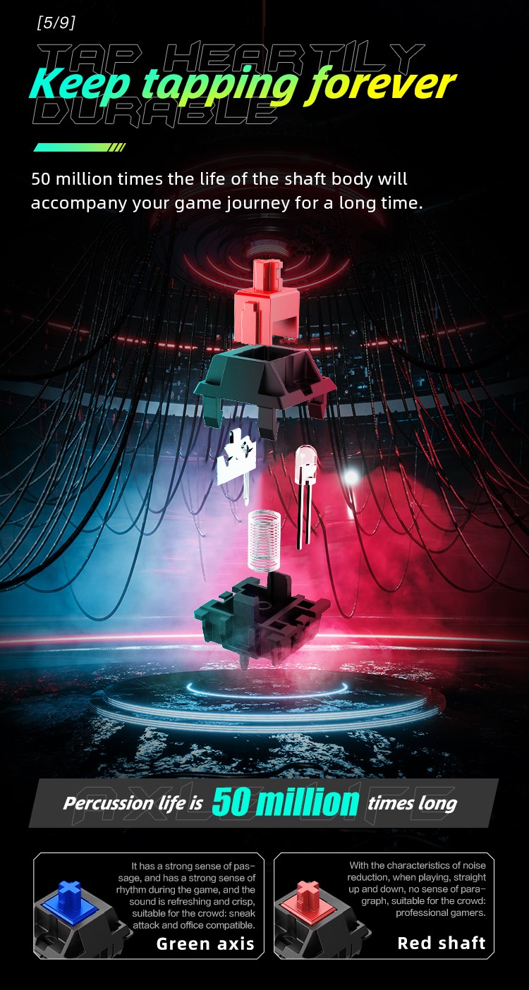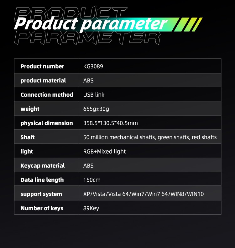 Equipped with vibrant L-shaped RGB lighting including 3 custom modes and 20 game effects, plus NKRO for all-keys-without-conflict performance. Durable 50 million cycle switches and ABS keycaps ensure longevity. Wired via removable 1.5m Type-C cable, compatible with Windows XP to Win10.