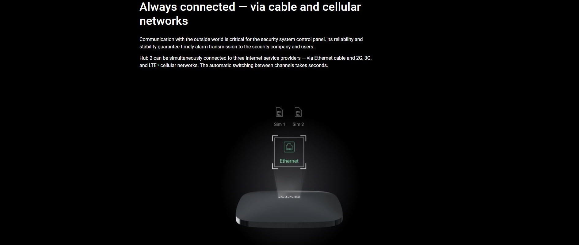 - Hub 2 can be simultaneously connected to three Internet service providers — via Ethernet cable and 2G, 3G, and LTE 2 cellular networks. The automatic switching between channels takes seconds