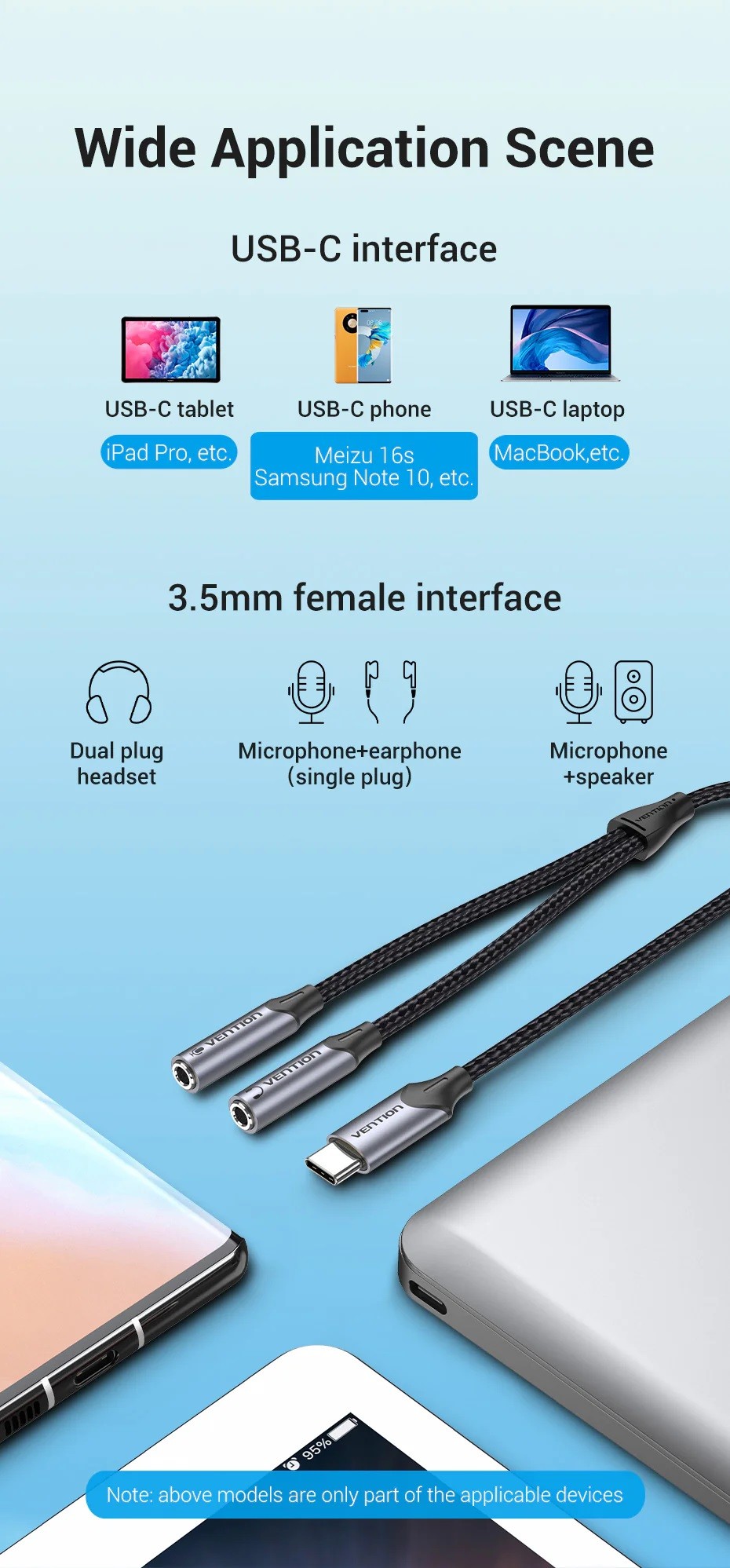 - Wide Compatibility: Designed for versatility, the USB-C connector works flawlessly with a wide range of devices. This includes popular models such as USB-C smartphones, tablets, and laptops—like the iPad Pro, Samsung Note 10, and MacBook. Additionally, the 3.5mm ports are compatible with dual-plug headsets, single-plug microphone/earphone combinations, and setups that include both a microphone and speaker.