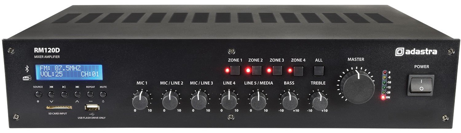 5-channel 19" rack-mountable mixer-amplifier, tailored to commercial sound installations to power 100V line speakers or standard speakers down to a 4 Ohm load. Input options include XLR (with switchable phantom power), mic/line jack, and RCA line. Features an inbuilt DAB+/FM radio tuner, front-mounted SD/USB ports, and Bluetooth® connectivity, all controlled via an integrated media player for hassle-free playback. A switchable ‘voiceover’ feature automatically lowers the background music volume when a signal is detected via mic input 1 and rear panel 24V contacts can mute all except mic input 1 when triggered. Outputs on screw terminla are via 4 switchable zones with a separate "always on" output for priority alert speakers.