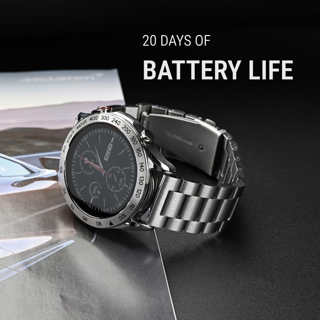 Sporty yet refined smartwatch with a stainless steel body and a 20-day typical battery life.