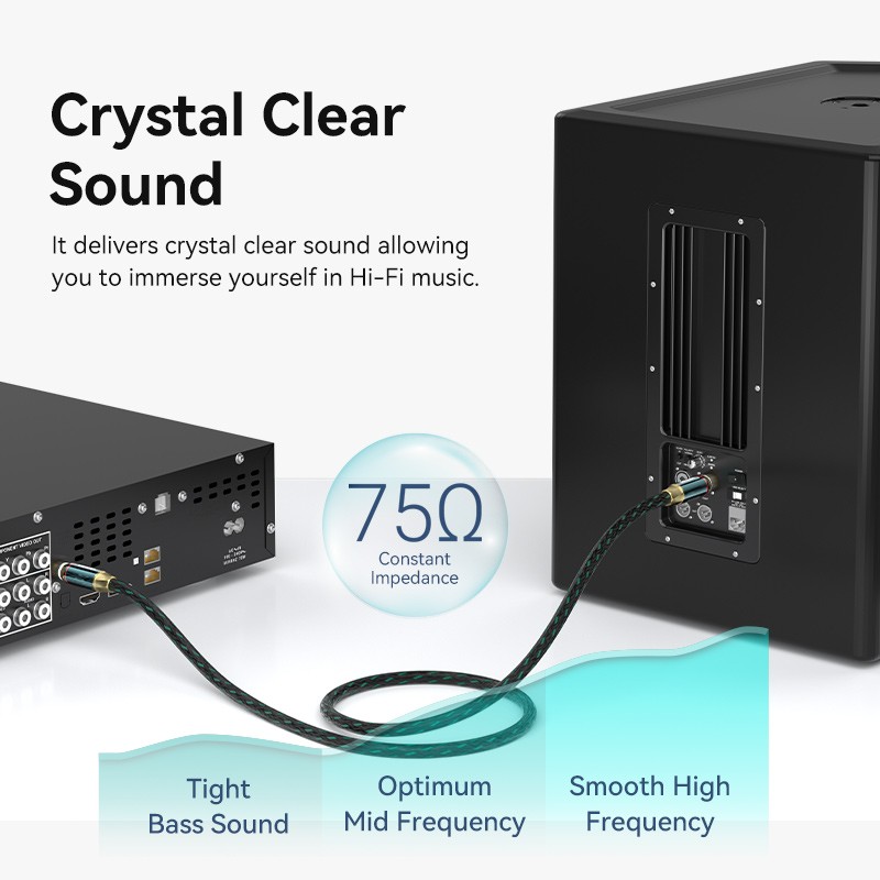 - Crystal Clear Sound: Forget about muffled audio and distorted frequencies. The Vention Hi-Fi Coaxial Audio Cable utilizes silver-coated oxygen-free copper (OFC) conductors, renowned for their superior conductivity and signal clarity. This ensures a pure and balanced audio signal transmission, bringing your music, movies, and games to life. The cable maintains a consistent 75Ω impedance, further enhancing the accuracy and detail of your sound. Enjoy tight, punchy bass, a well-defined mid-range, and smooth, extended high frequencies.