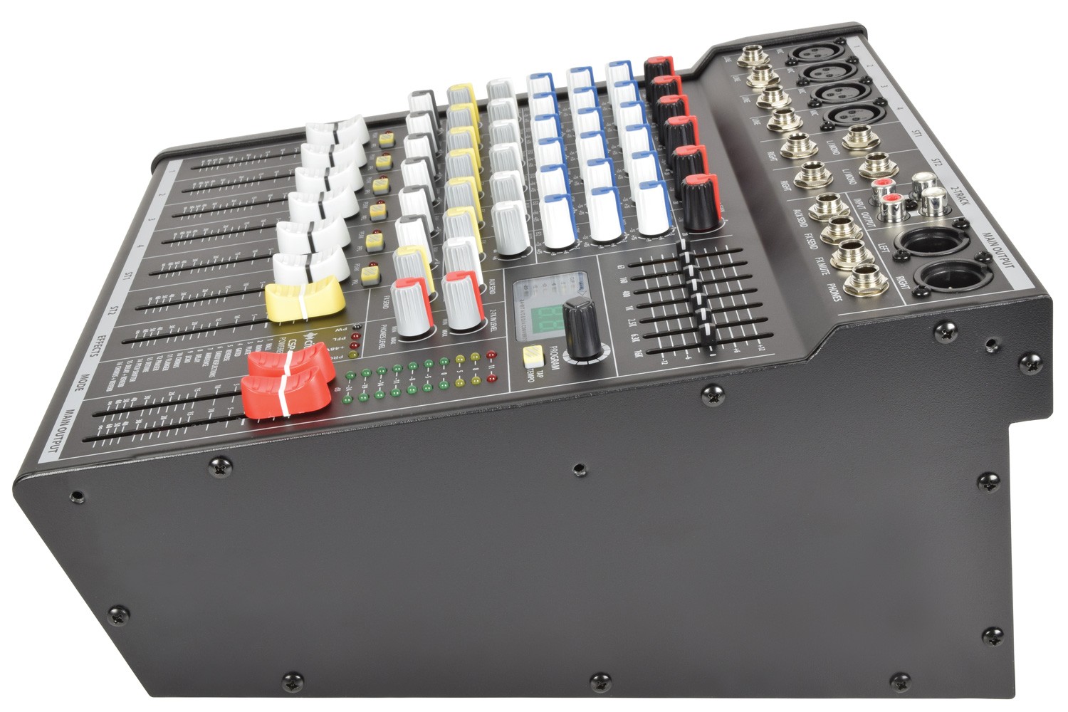 Powered 8-channel mixer with balanced mic/line and 2 stereo inputs, 3-band per-channel EQ, aux send, 16-program DSP with tap tempo, 7-band global graphic EQ, built-in stereo amplifier, balanced main outputs.