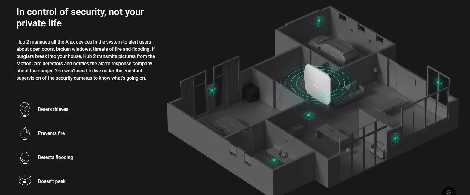 - Hub 2 manages all the Ajax devices in the system to alert users about open doors, broken windows, threats of fire and flooding. If burglars break into your house, Hub 2 transmits pictures from the MotionCam detectors and notifies the alarm response company about the danger. You won’t need to live under the constant supervision of the security cameras to know what’s going on