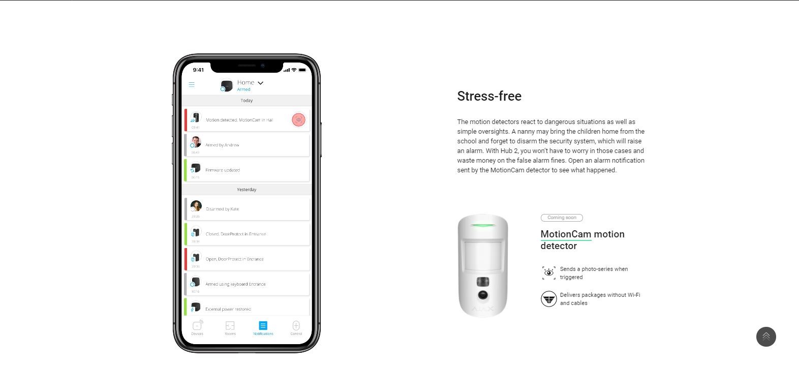 - The motion detectors react to dangerous situations as well as simple oversights. A nanny may bring the children home from the school and forget to disarm the security system, which will raise an alarm. With Hub 2, you won’t have to worry in those cases and waste money on the false alarm fines. Open an alarm notification sent by the MotionCam detector to see what happened