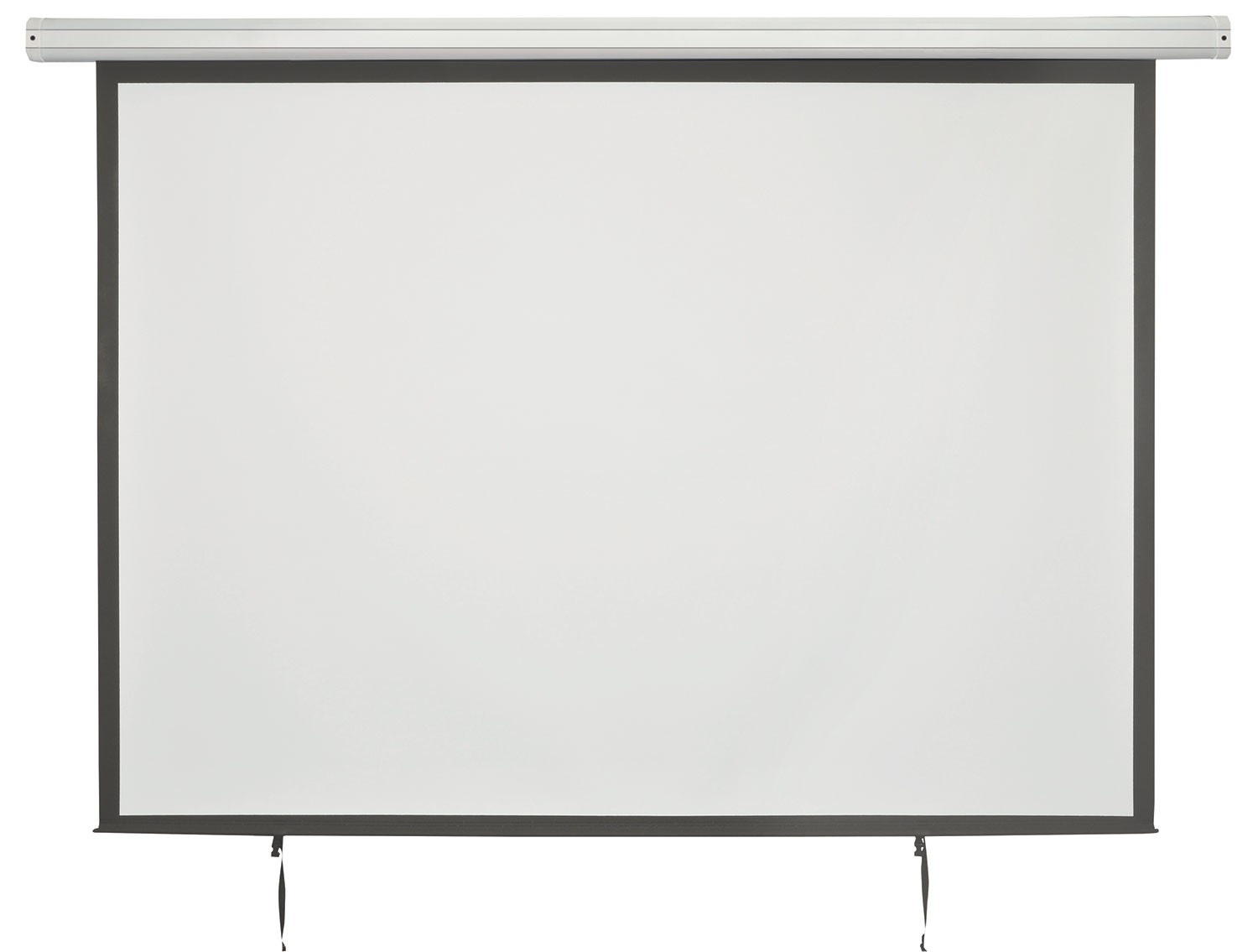 Electric projector screen with built-in electric motor controlled via the in-line switch or remote control. The screen is housed in a white steel case with mounting brackets on either end, allowing installation onto ceilings or walls. The screen itself has a weighted bottom bar to prevent the screen jamming in the case or curling. Suitable for all types of installation such as classrooms, auditoriums or places of worship.