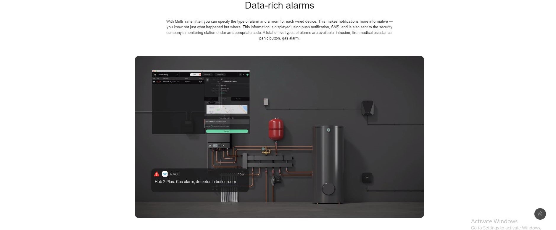 - With MultiTransmitter, you can specify the type of alarm and a room for each wired device. This makes notifications more informative — you know not just what happened but where. This information is displayed using push notification, SMS, and is also sent to the security company's monitoring station under an appropriate code. A total of five types of alarms are available: intrusion, fire, medical assistance, panic button, gas alarm