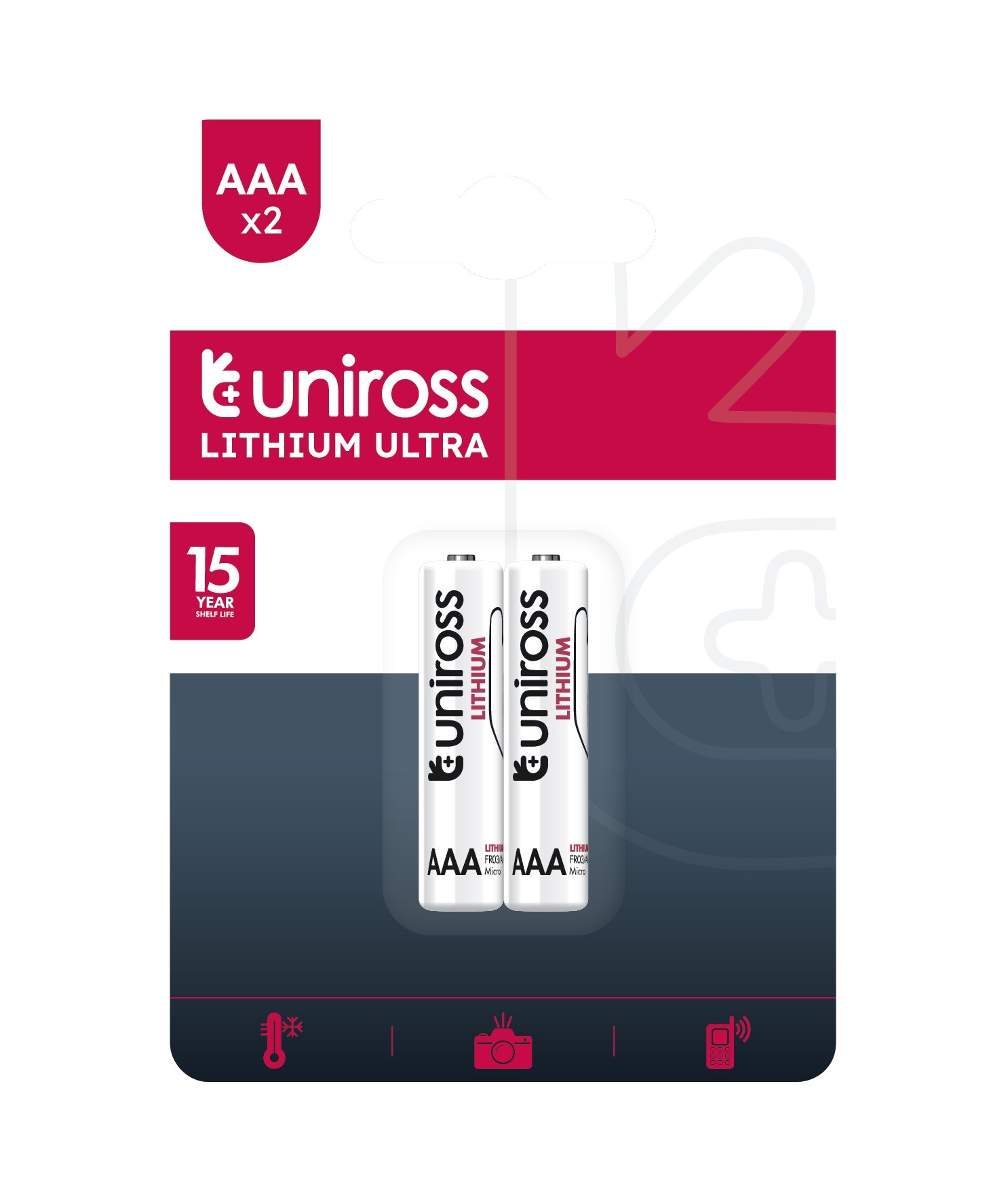 Uniross Lithium AAA battery 1250mAh, 2-pack; 2–5x longer life than alkaline; low self-discharge up to 15 years.