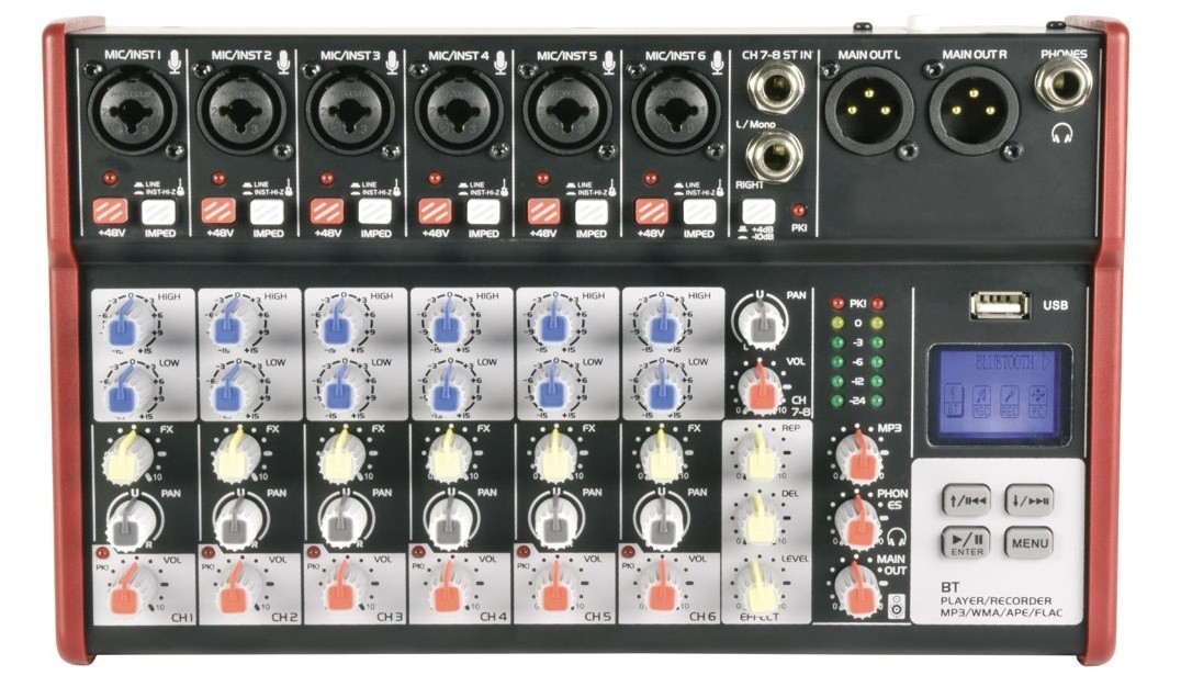 Compact format audio mixer with 2, 4 or 6 mono input channels and a stereo line input. Each mono channel has a combo XLR/jack input with individually switchable mic/instrument impedance and +48V phantom power for the XLR. Input channels have High/Low EQ and Pan controls and mono channels also have Effects level to vary the amount of internal digital delay effect added for vocals or instruments. An internal player/recorder with backlit display can accept a USB memory stick containing compressed audio files in various formats or alternatively connect to a smart phone via BT wireless link. Output is delivered on a pair of balanced XLR connectors and offers very low noise operation for high quality studio or live performances.