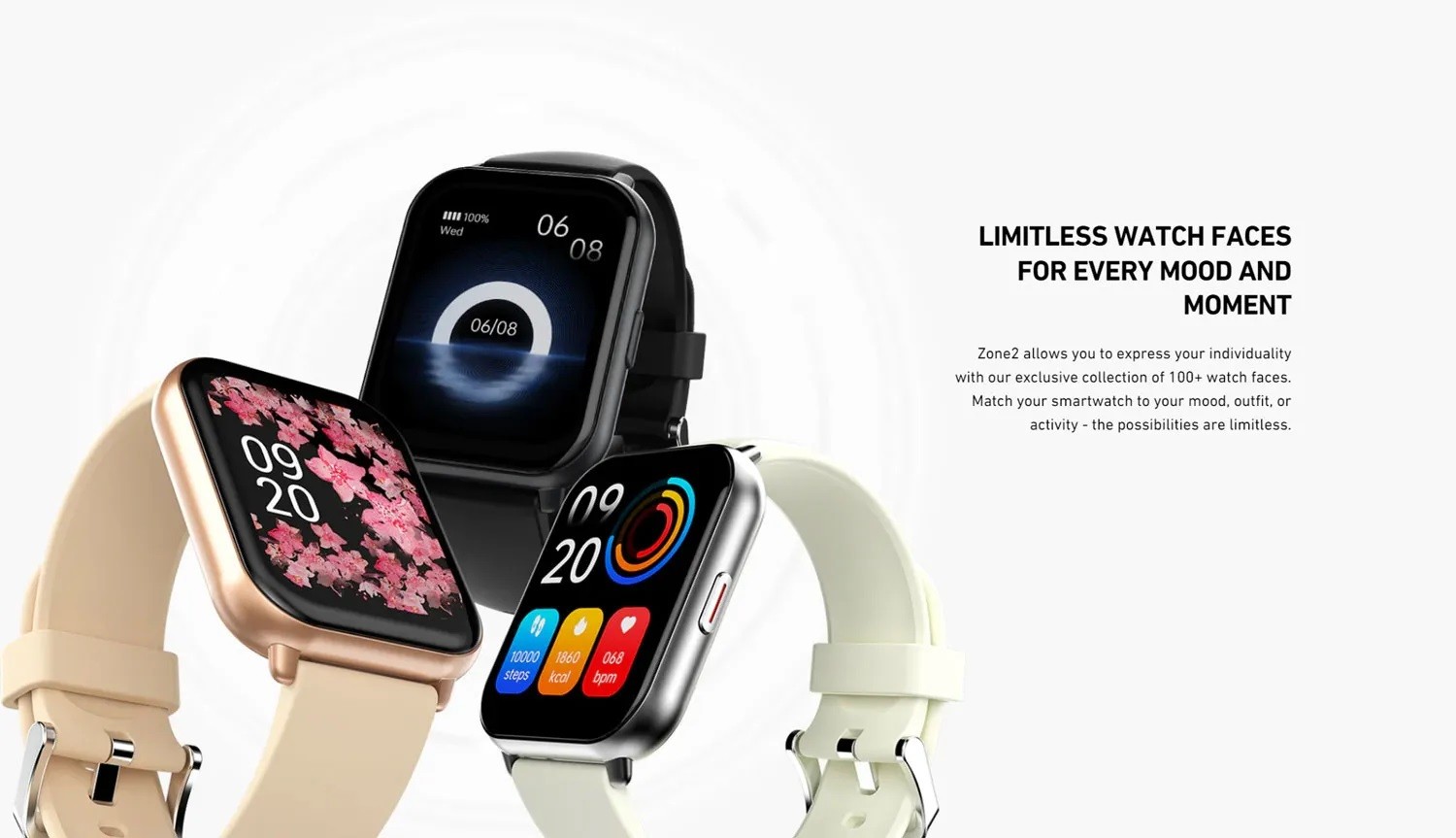 - Limitless watch faces for every mood and moment: Zone2 allows you to express your individuality with our exclusive collection of 100+ watch faces. Match your smartwatch to your mood, outfit, or activity - the possibilities are limitless.