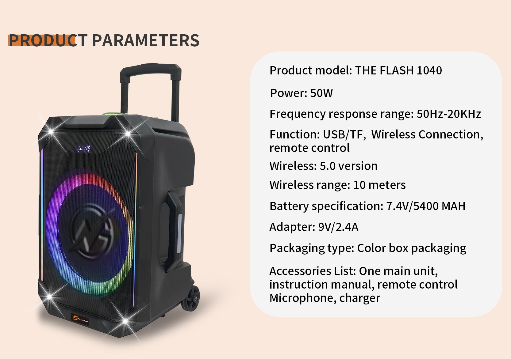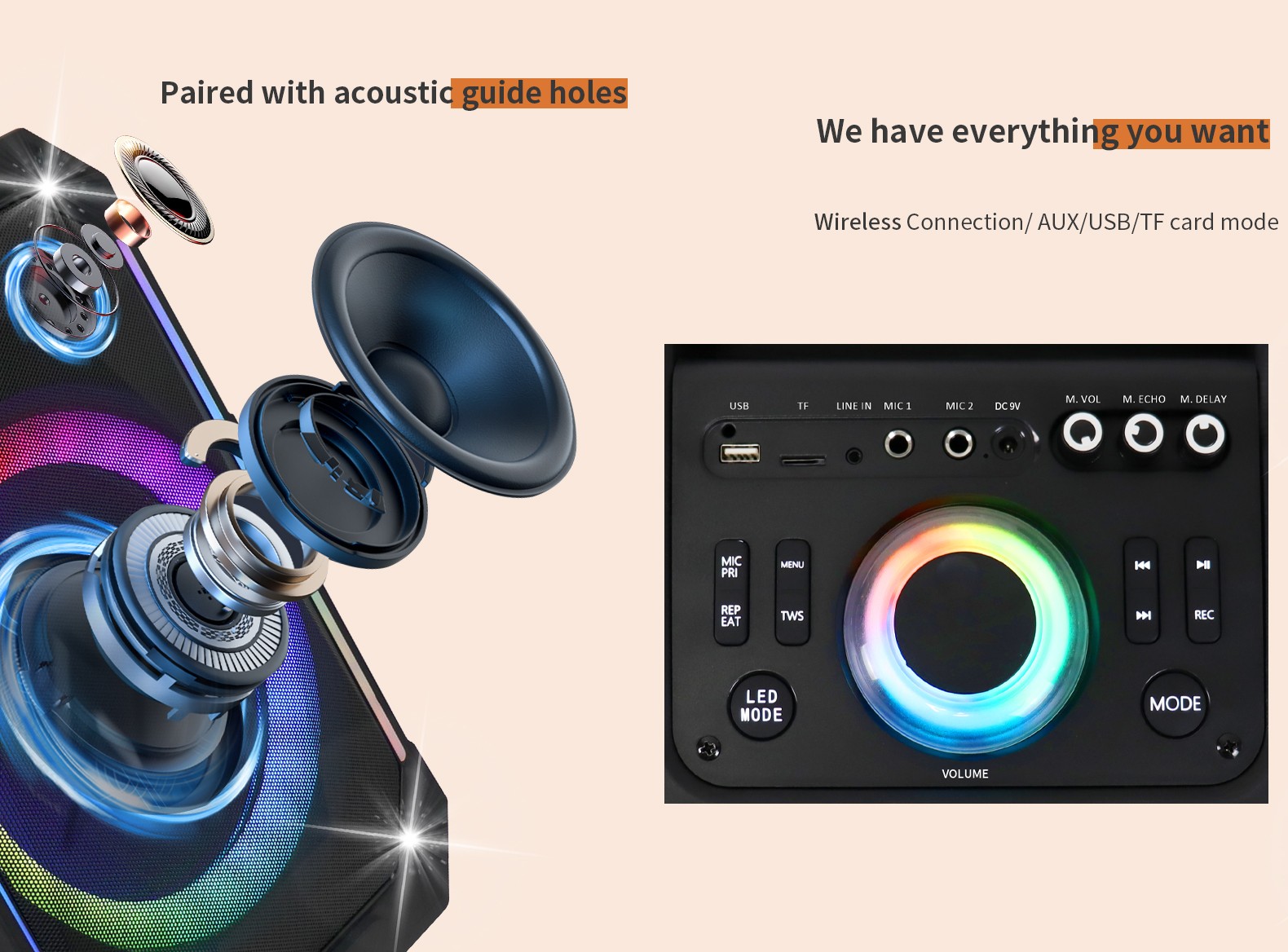 Powerful 10'' portable karaoke speaker with 1 wireless mic, LED lights, USB and Bluetooth for wireless playback.