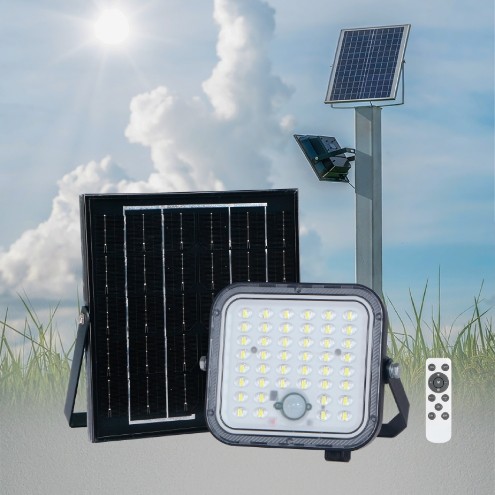 Solar-powered floodlight with panel, remote control and PIR sensor; IP65, natural white light, 1400 lumens, black body.