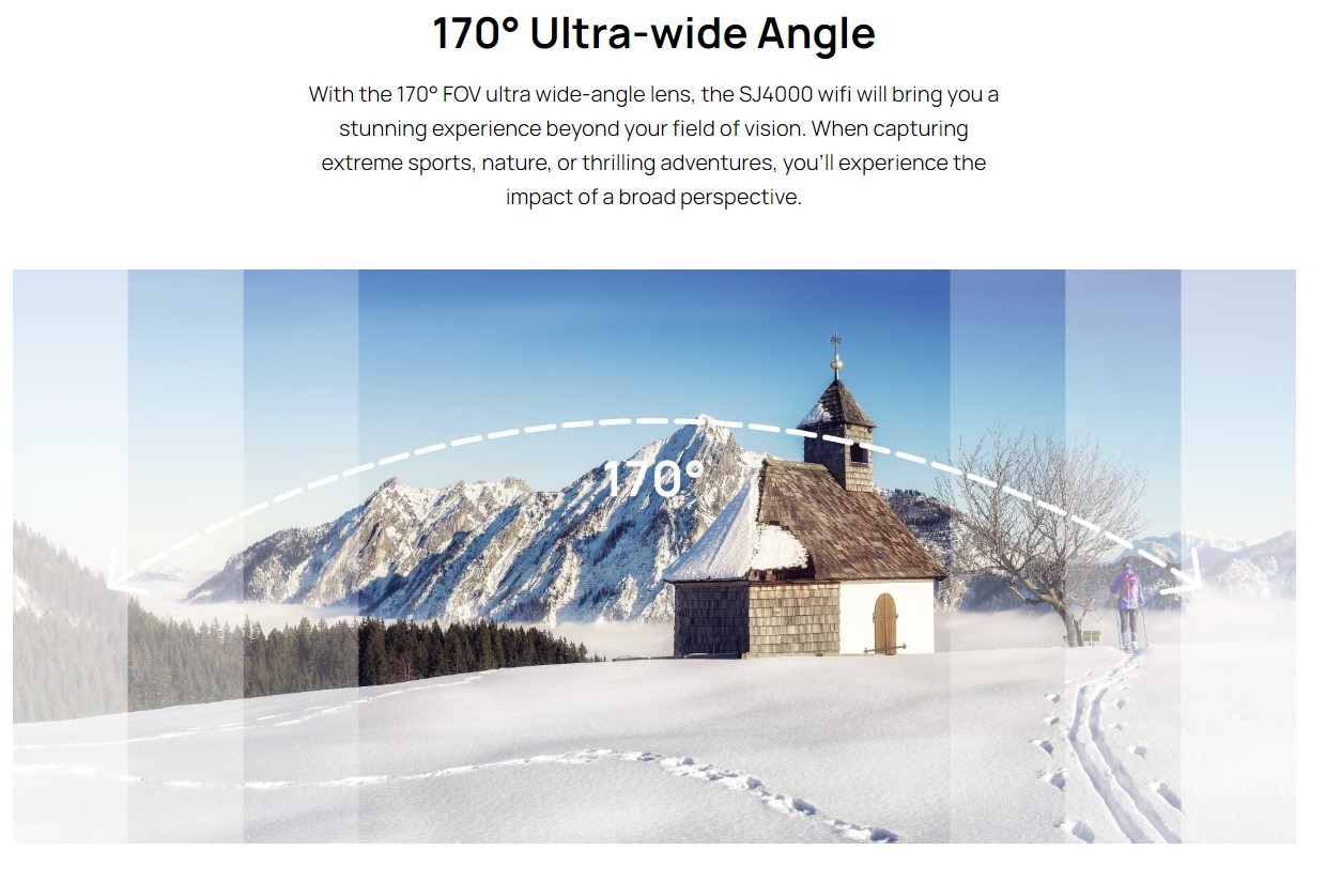 - 170° Ultra-wide Angle With the 170° FOV ultra wide-angle lens, the SJ4000 wifi will bring you a stunning experience beyond your field of vision. When capturing extreme sports, nature, or thrilling adventures, you’ll experience the impact of a broad perspective.