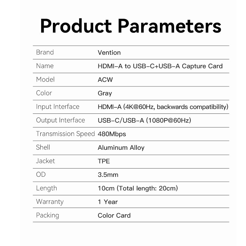 Elevate your digital creativity with the USB/USB-C External Capture Card by Vention, the ultimate tool for seamless high-quality video capture and streaming. Designed with versatility and performance in mind, this compact and portable capture card brings professional-grade features within reach for users of all levels whether you're a gamer, content creator, or professional in need of reliable live broadcasting solutions.