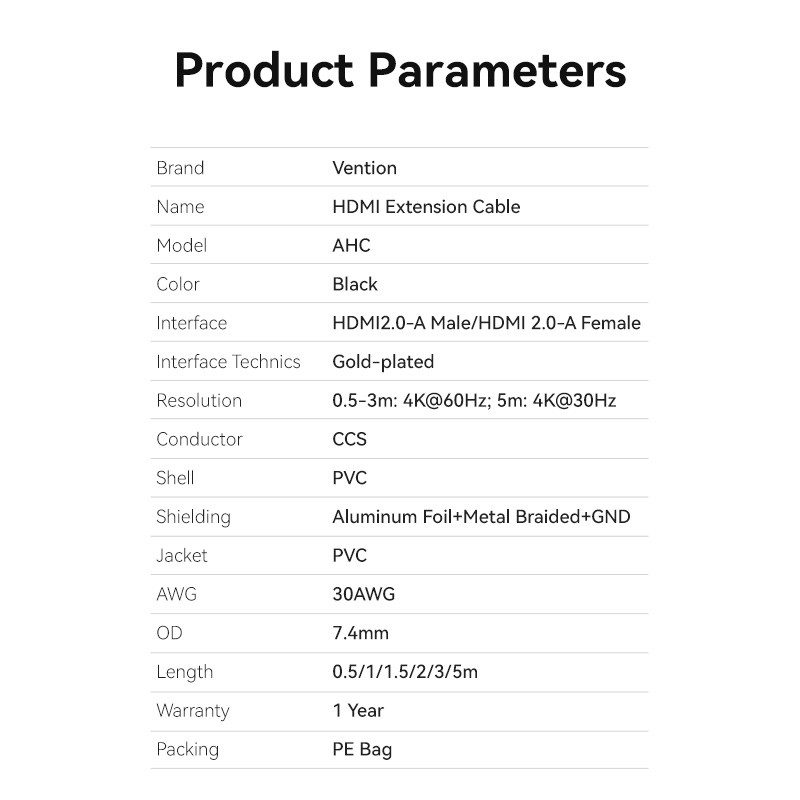 Vention 4K High-Speed HDMI Extension Cable, HDMI 2.0, M-F, 1.0m length; ideal for high-quality video and audio connections.