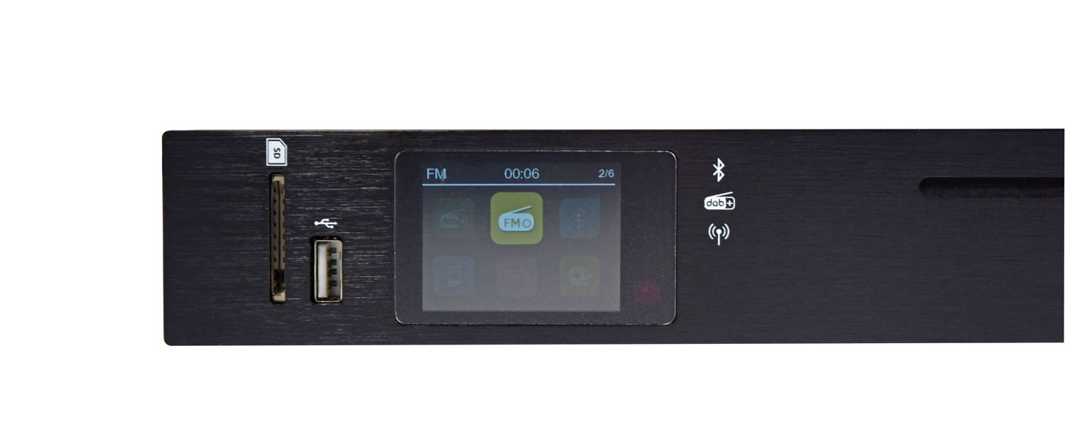1U rack-mountable audio source with 6 playback modes; front panel shows full-color TFT display, includes remote; supports CD, USB, SD, FM, DAB/DAB+, Bluetooth.