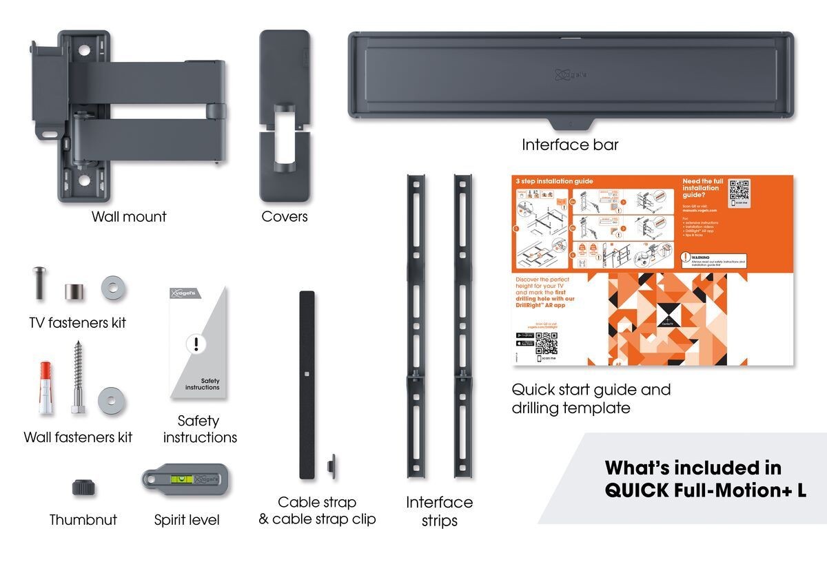 - Wall mount, Cable straps, Wall mounting kit with fischer® Duo Power plugs, TV fasteners kit, Spirit level, Quick Installation Guide, DrillRight™ AR app, Drilling template