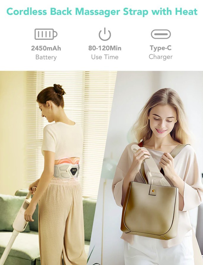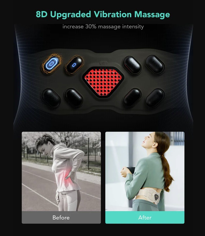 - Equipped with 8 heating massage heads and 31 red light therapy beads, the massager penetrates up to 10mm deep to promote circulation, relieve menstrual pain, and ease muscle soreness. Choose from 3 heat levels (100.4°F - 107.6°F) for full lumbar warmth.