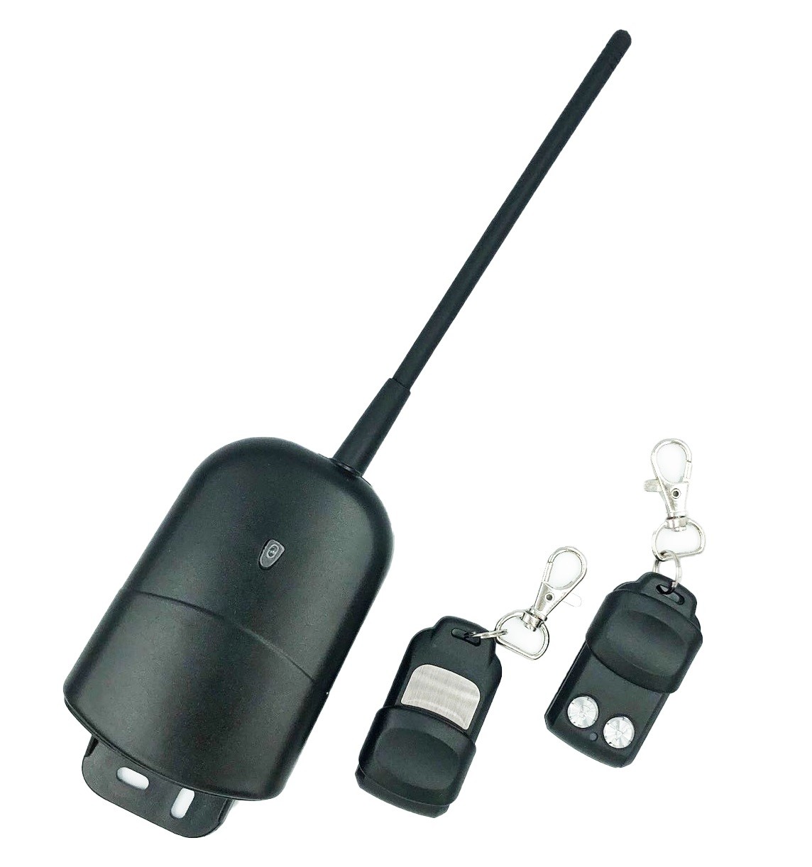 Outdoor RF receiver kit with two self-learning remotes; waterproof box; suitable for indoor and outdoor use.