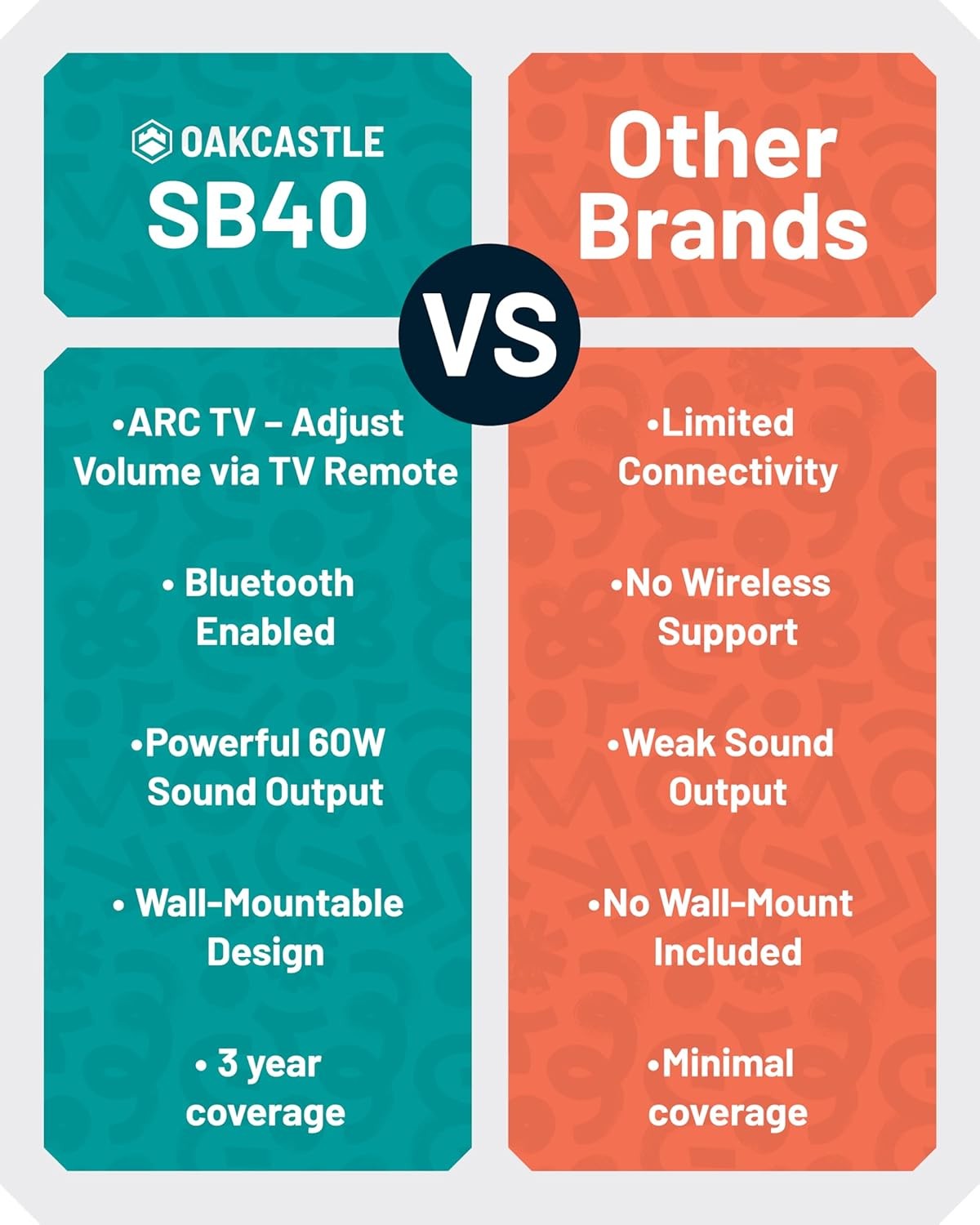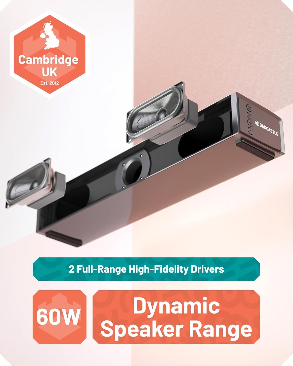 Oakcastle SB40 soundbar delivering 60W total power with Bluetooth, HDMI, and remote control.