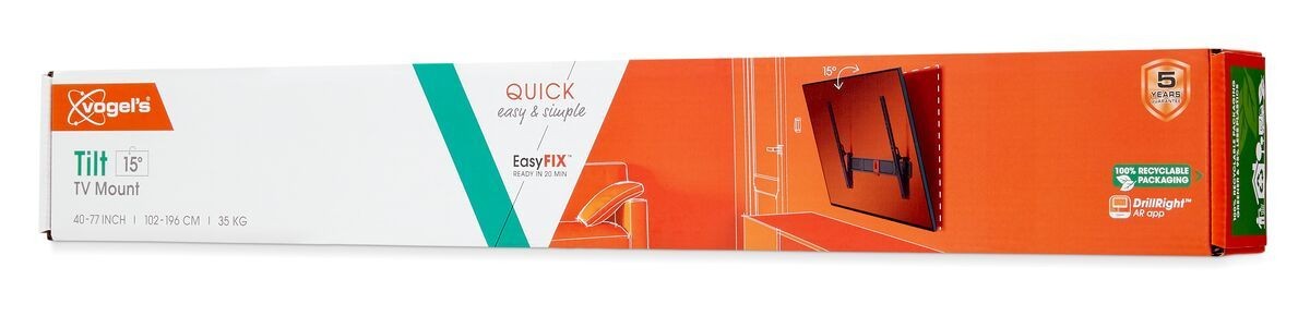 Want to hang your TV a bit higher on the wall and still enjoy watching it? This QUICK Tilt TV wall mount is exactly what you are looking for. You can install it extremely quickly and easily. In no more than 20 minutes, your TV is firmly in place. You can then tilt the TV 5°, 10° or 15° to set the ideal viewing angle. The TV wall mount is suitable for TVs from 40 to 77 inches and weighing up to 35 kg.