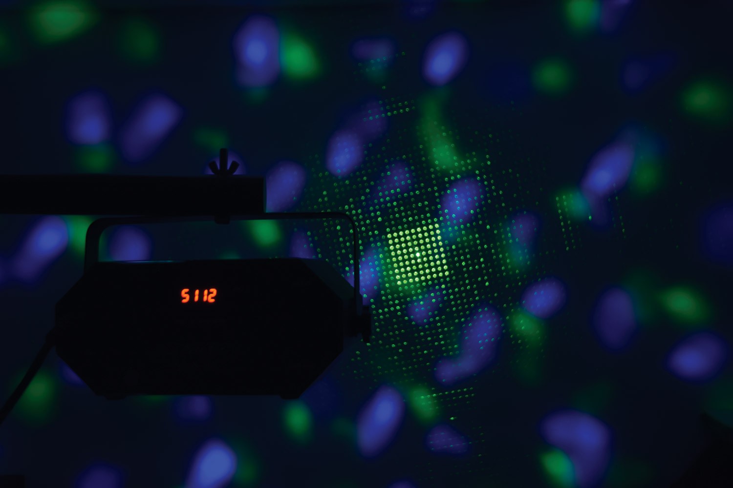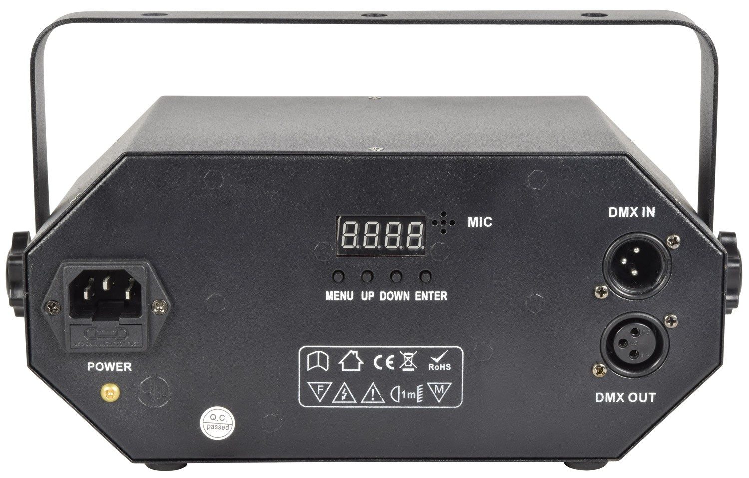 The Tetra is a 4-in-1 DMX light effect built into a single compact housing. A moonflower effect produces a wide pattern of colour from six 3W LEDs, countered with an RGBW aqua ripple effect. At the centre of the housing are 4 high power UV/strobe LEDs and a red/green pattern laser. All 4 effects are operated by internal auto and sound-activated programs or DMX512 control. An impressive combination of effects to add to any lighting rig without the need to add any large fixtures.