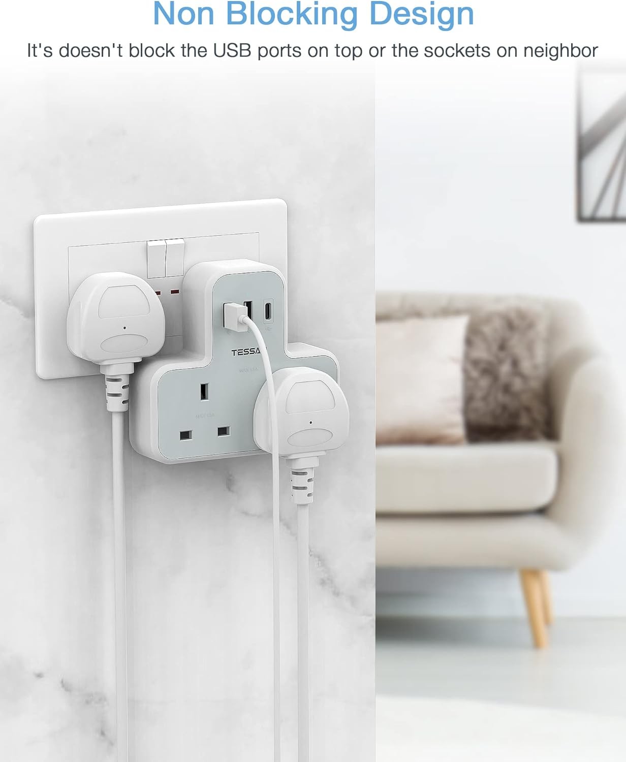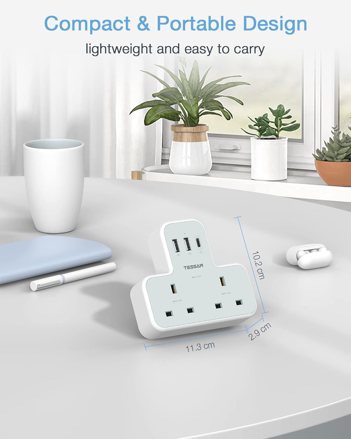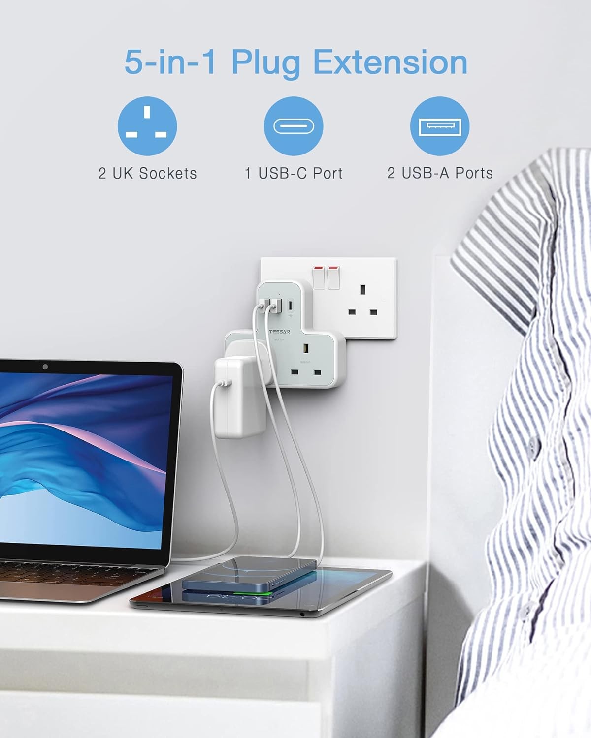 - 5 in 1 Multi Plug This double plug features 2 grounded AC sockets, 1 USB C plug and 2 USB plug, ideal for charging indoors without bulky extension cords. 1 extension plug turns to 5 electronic devices