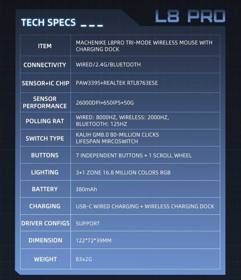 - High-Precision .With an adjustable DPI range of 800 to 26,000 and four selectable polling rates, the L8 Pro provides effortless speed adjustments for an unbeatable gaming experience.