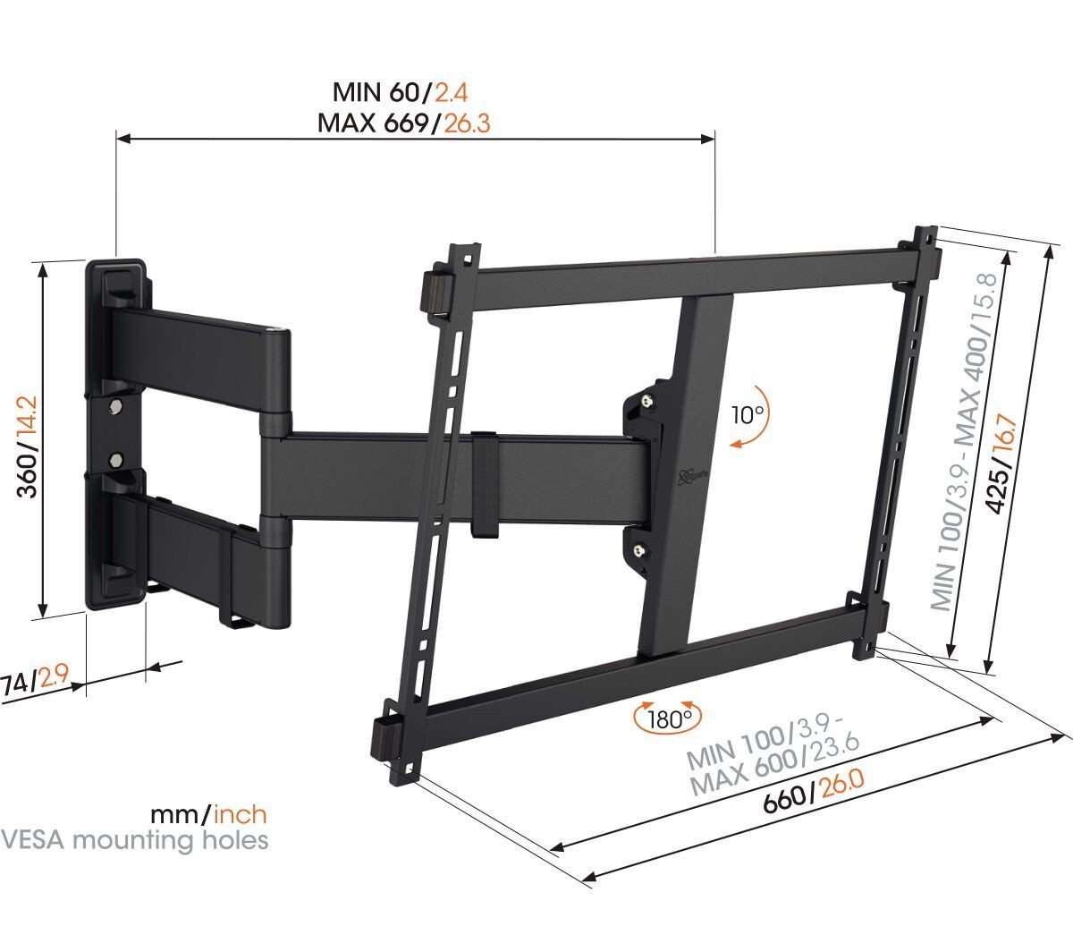 This is the one: the strongest Full-Motion+ TV wall mount in our family-friendly COMFORT series. Stylish and safe. The wall mount is suitable for TVs up to 100 inches in size and weighing up to 55 kg. Depending on your TV size, the wall mount can be rotated up to 180° and tilted up to 10° for optimal viewing comfort. Your TV is guaranteed to be mounted safely and securely. If you would like to enjoy your large TV to the fullest from every angle, this is the TV wall mount you need
