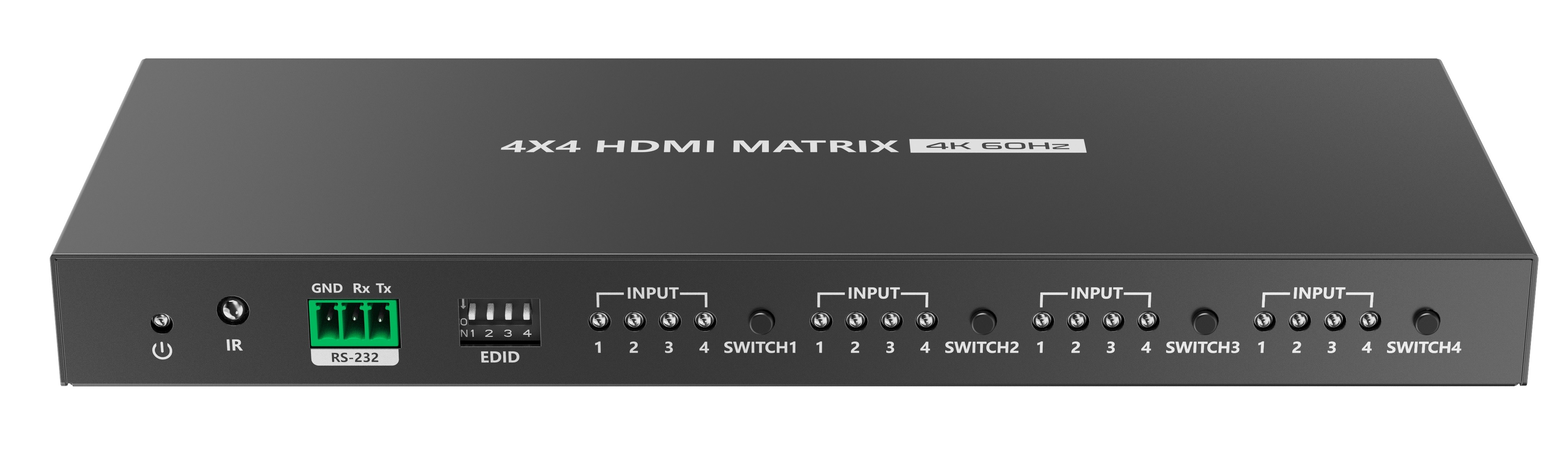4x4 HDMI matrix switch with 4 inputs/4 outputs; supports up to 4K60Hz HDR; multiple control options including IR remote, buttons, and RS232.